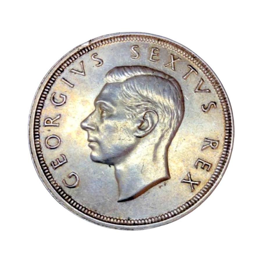 Immerse yourself in the rich history of numismatics with this exquisite 5 Shillings George VI coin from South Africa, minted between 1948 and 1950. Issued during the reign of King George VI, this silver coin holds a denomination of 5 Shillings, equivalent to ¼ Pound in the currency of that time. With a silver composition of .800, a weight of 28.28g, and a diameter of 38.61mm, this round coin boasts a milled edge and a medal alignment. The coin’s obverse features the portrait of King George VI, while the reverse showcases the intricate design of the South African coat of arms. A piece of history, this coin was demonetized on 31 March 1961, adding to its collectible allure. Ideal for both seasoned collectors and history enthusiasts, this coin represents a tangible connection to a bygone era and makes for a captivating addition to any collection.