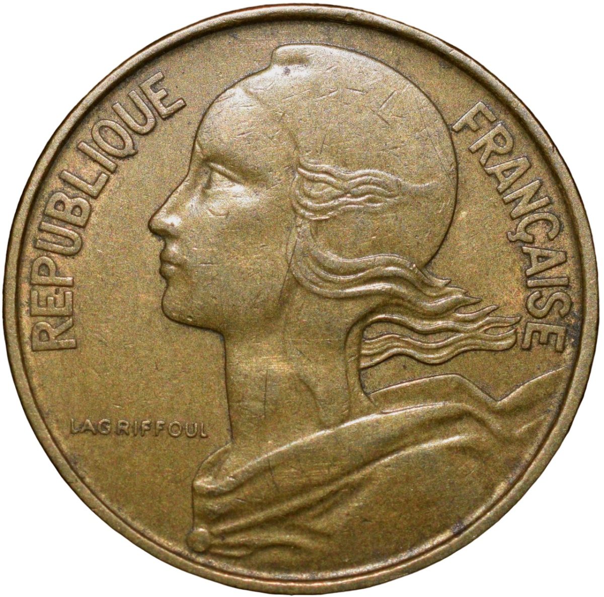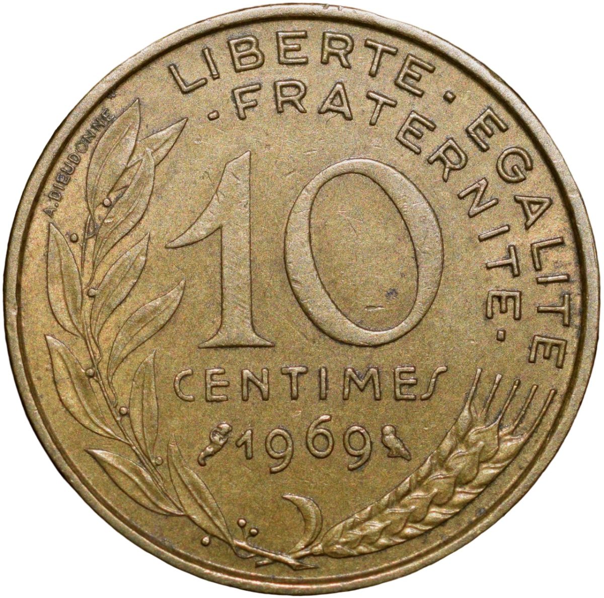 Brass 10 Centimes of France ( AD 1969) with Marianne face left