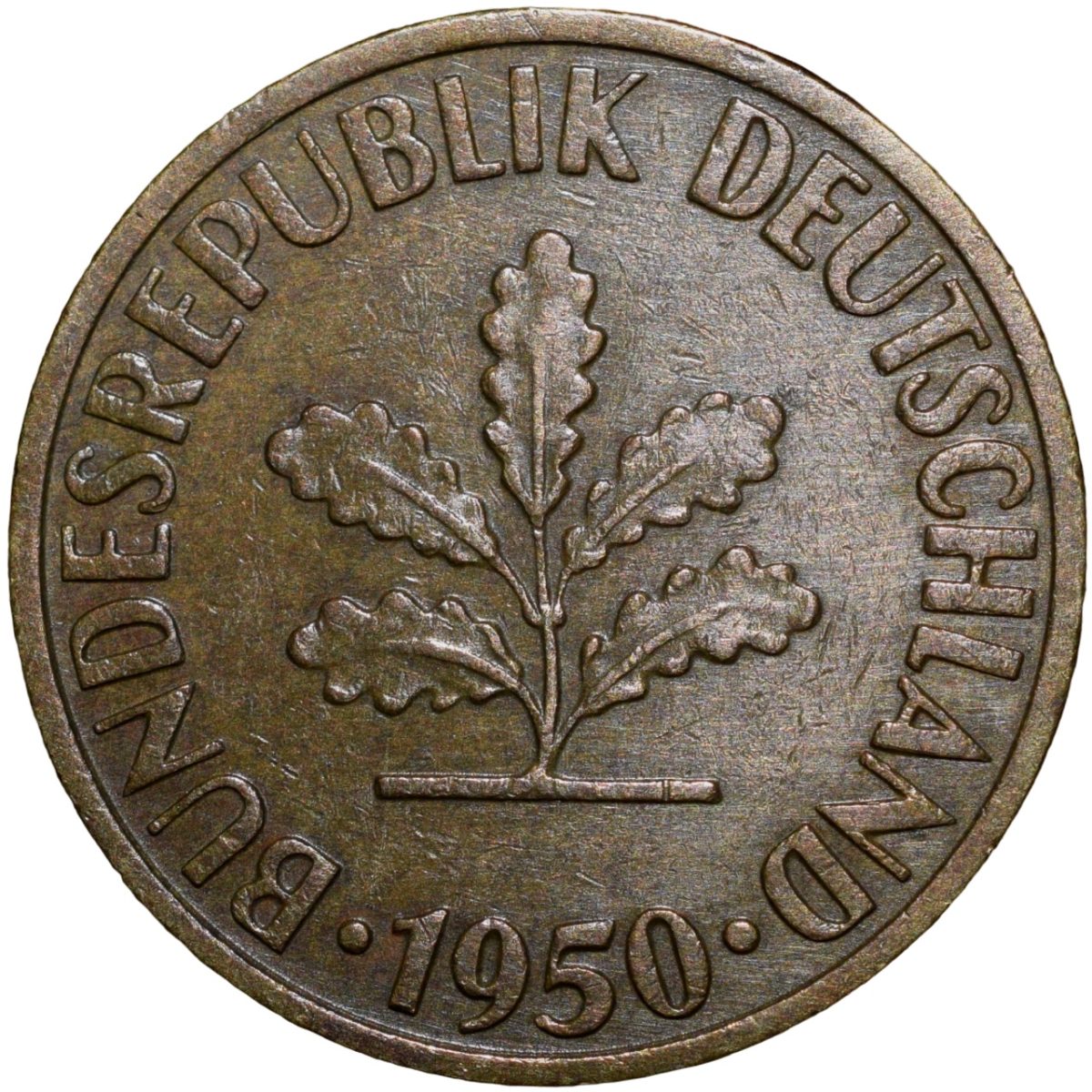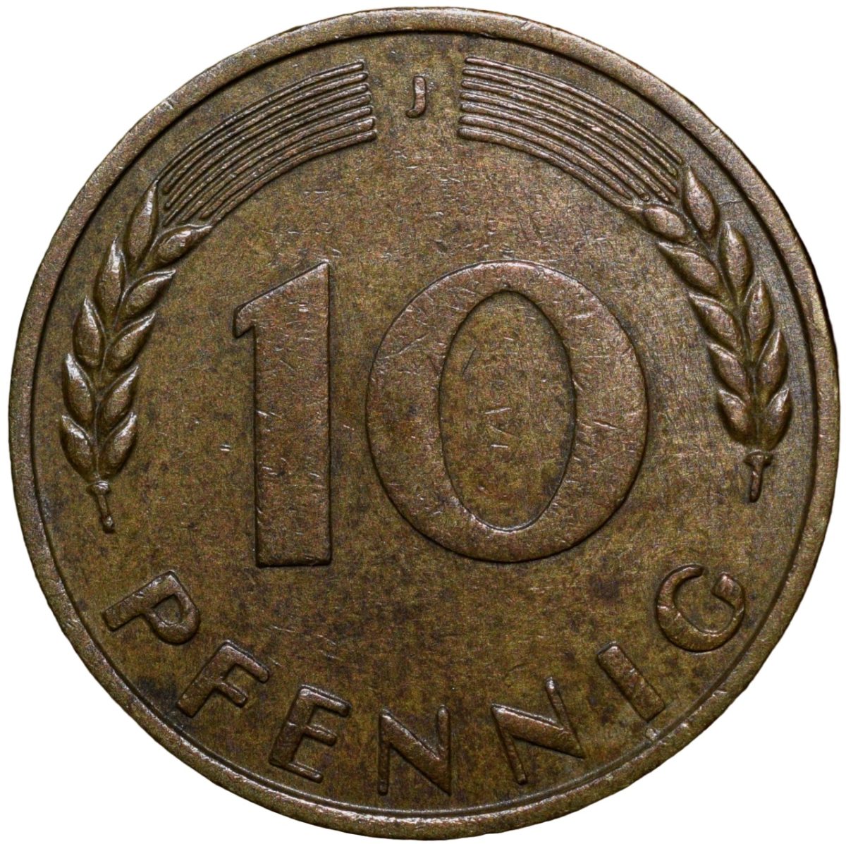 Germany Country, (AD 1950), Brass 10 Pfennig, Obv: An oak seedling above the date, Rev: The mintmark in between two rye ears above the denomination, 3.98 Gms, 21.30 mm, Extremely Fine.