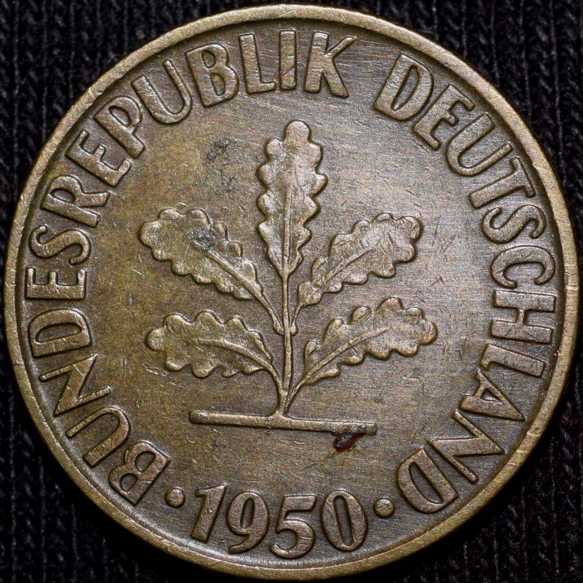 Brass 10 Pfennig of Germany (AD 1950) with Oak Sapling