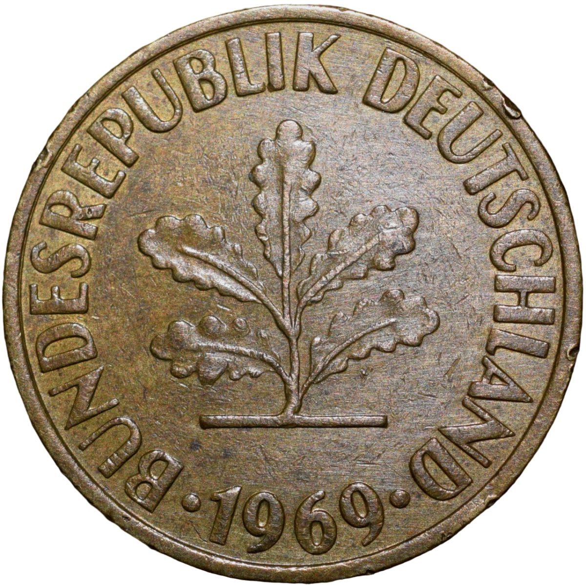 Germany Country, (AD 1969), Brass 10 Pfennig, Obv: An oak seedling above the date, Rev: The mintmark in between two rye ears above the denomination, 3.98 Gms, 21.30 mm, Extremely Fine.