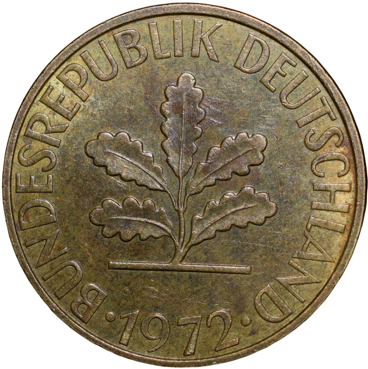 Germany Country, (AD 1972), Brass 10 Pfenning, Obv: An oak seedling above the date, Rev: The mintmark in between two rye ears above the denomination, 3.98 Gms, 21.30 mm, Extremely Fine.