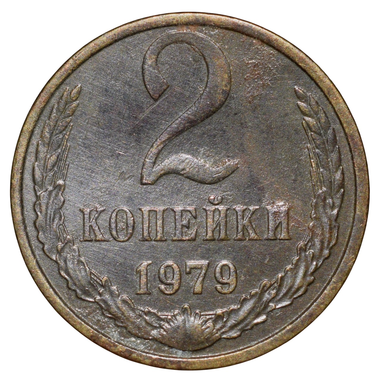 Russia, (AD 1979), Brass 2 Kopecks, Obv: The arms of the Soviet Union (a hammer and sickle overlain on a globe above the sun with rays, all within wreath or sheaf of wheat stalks, star above within 15 ribbons on the wreath (7 + 1 + 7 ribbons), Rev: The denomination above the date within a partial wreath, 1.96 Gms, 16.77 mm, Very Fine.