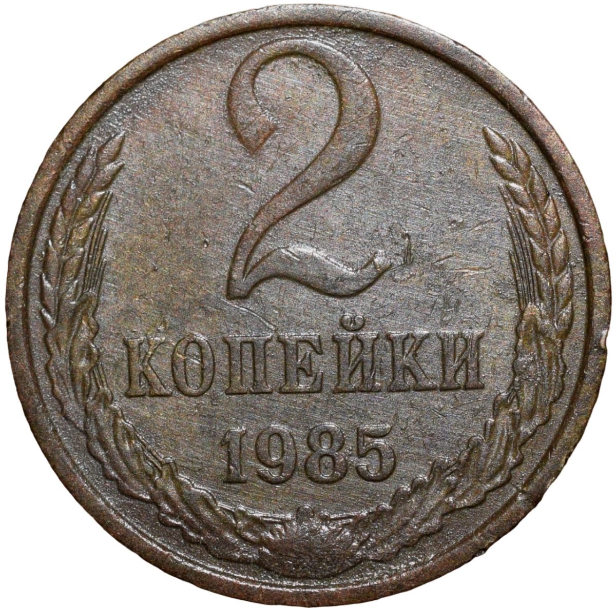 Russia, (AD 1985), Brass 2 Kopecks, Obv: The arms of the Soviet Union (a hammer and sickle overlain on a globe above the sun with rays, all within wreath or sheaf of wheat stalks, star above within 15 ribbons on the wreath (7 + 1 + 7 ribbons), Rev: The denomination above the date within a partial wreath, 1.96 Gms, 16.77 mm, Very Fine.
