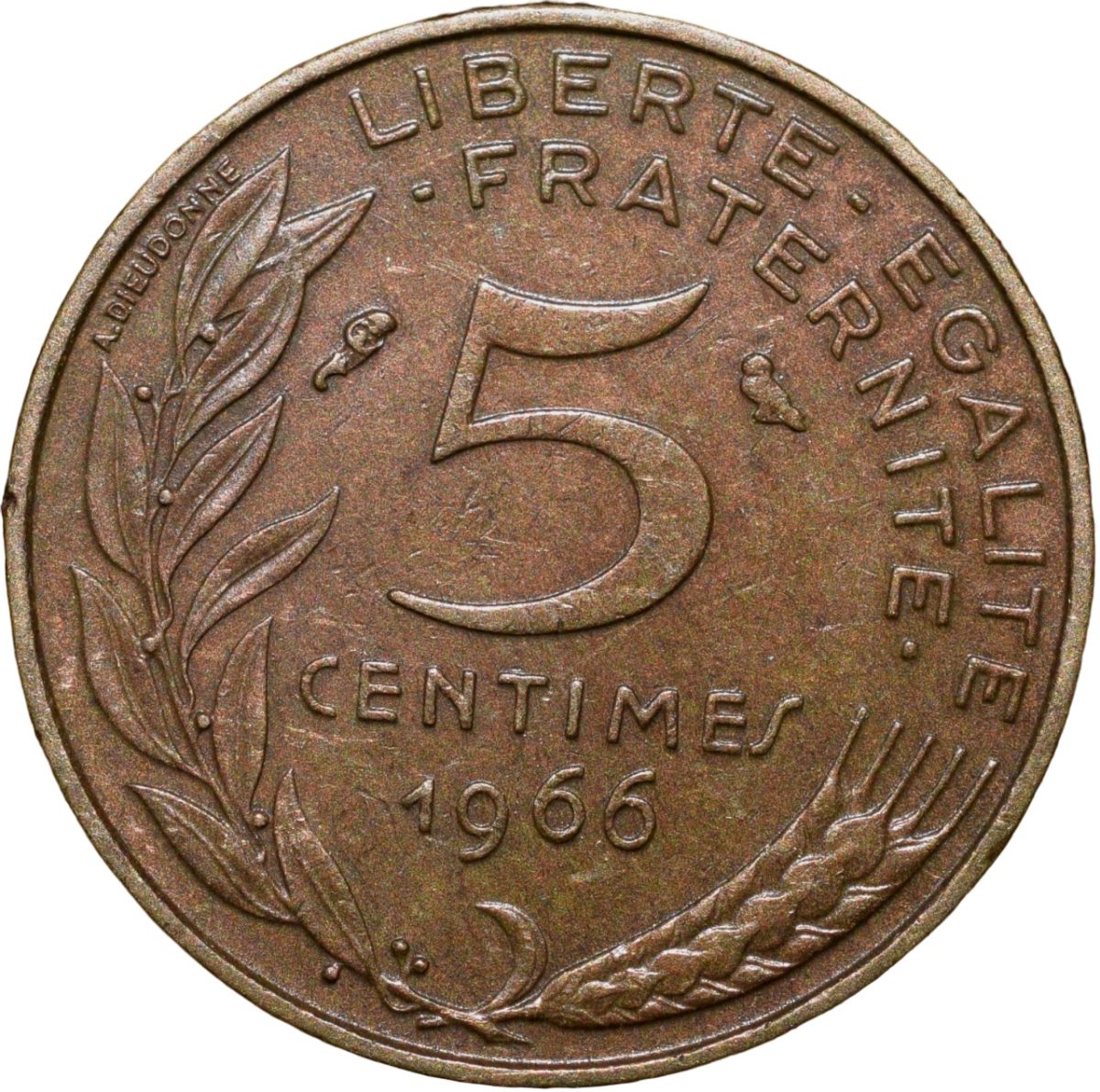 Brass 5 Centimes of France ( AD 1966) with Marianne face left