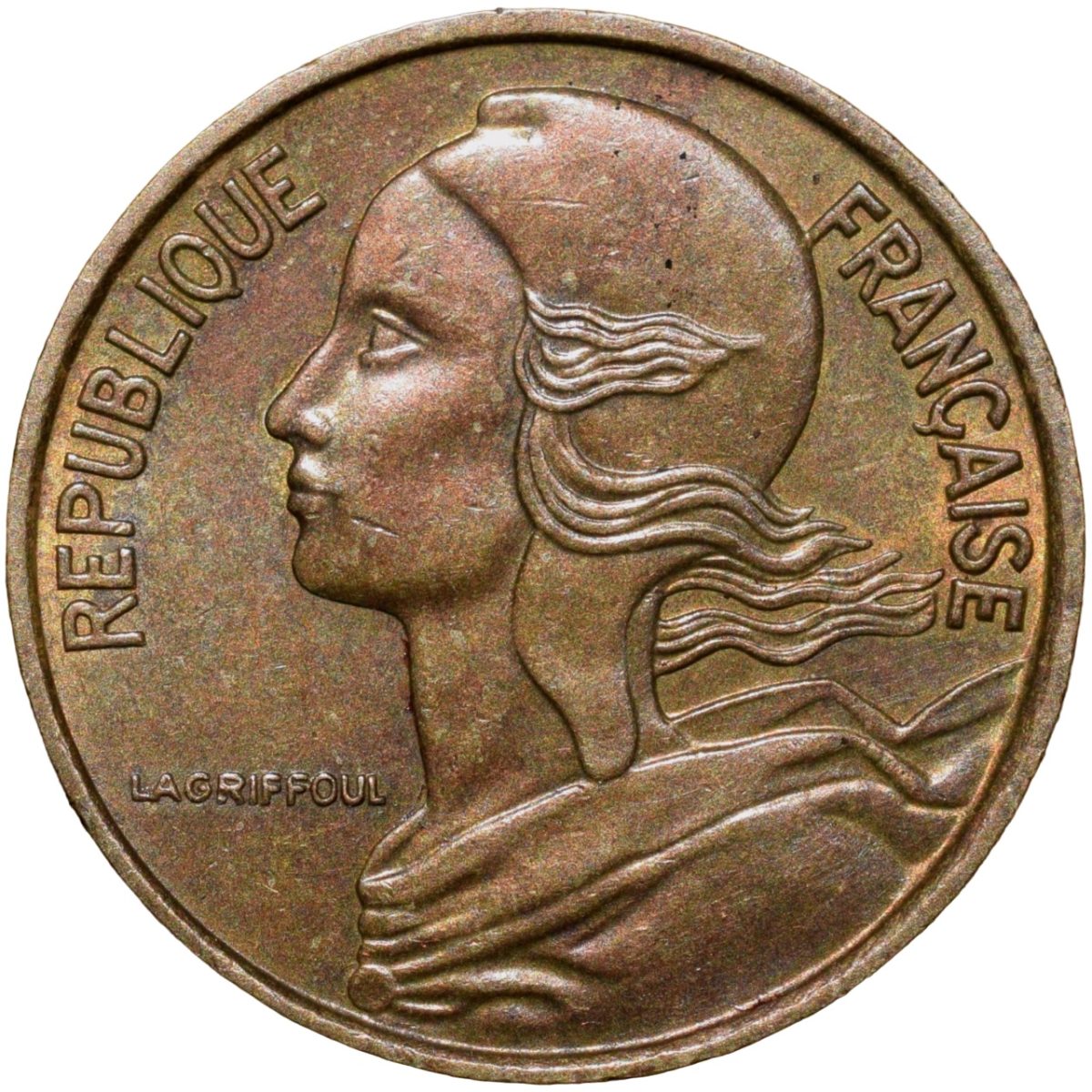 Brass 5 Centimes of France ( AD 1968) with Marianne face left