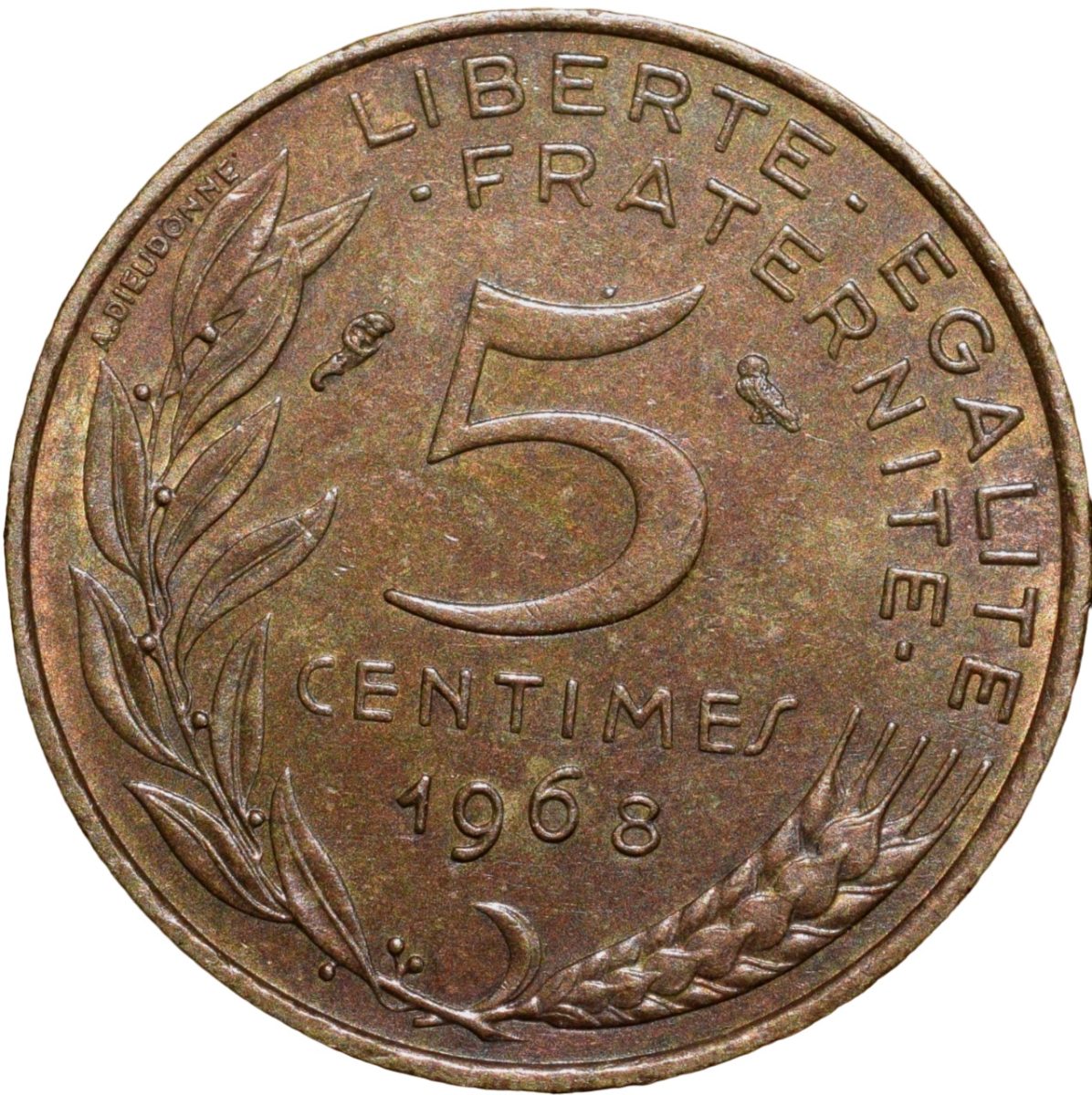 France (AD 1968), Brass 5 Centimes, Obv: Marianne in left profile wearing the Phrygian cap of liberty, a national emblem of France, dividing the country name, Rev: The value is surrounded with a wheatear, an olive branch and the French motto, 2.02 Gms, 15.50 mm, Extremely Fine.
