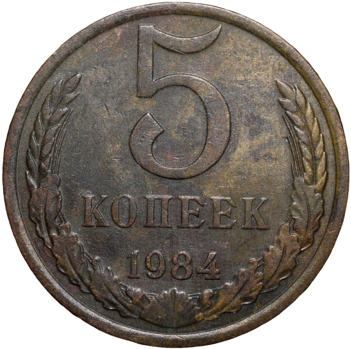 Russia, (AD 1984), Brass 5 Kopecks, Obv: The arms of the Soviet Union (a hammer and sickle overlain on a globe above the sun with rays, all within wreath or sheaf of wheat stalks, star above within 15 ribbons on the wreath (7 + 1 + 7 ribbons), Rev: The denomination above the date within a partial wreath, 4.48 Gms, 21.78 mm, About Extremely Fine.