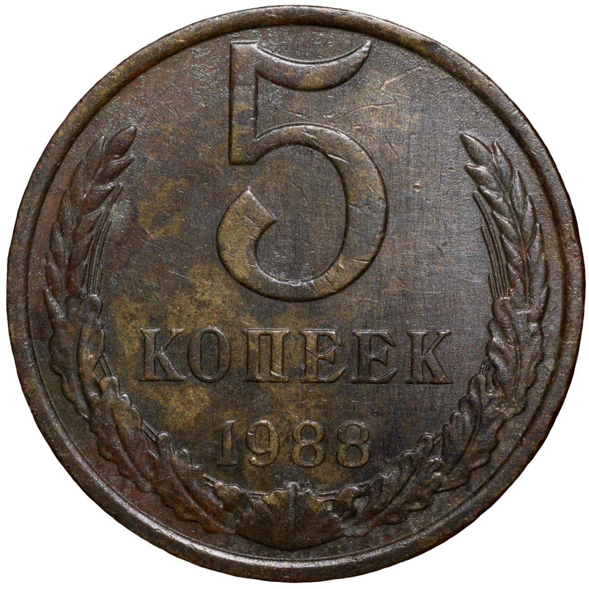 Russia, (AD 1988), Brass 5 Kopecks, Obv: The arms of the Soviet Union (a hammer and sickle overlain on a globe above the sun with rays, all within wreath or sheaf of wheat stalks, star above within 15 ribbons on the wreath (7 + 1 + 7 ribbons), Rev: The denomination above the date within a partial wreath, 4.48 Gms, 21.78 mm, About Extremely Fine.