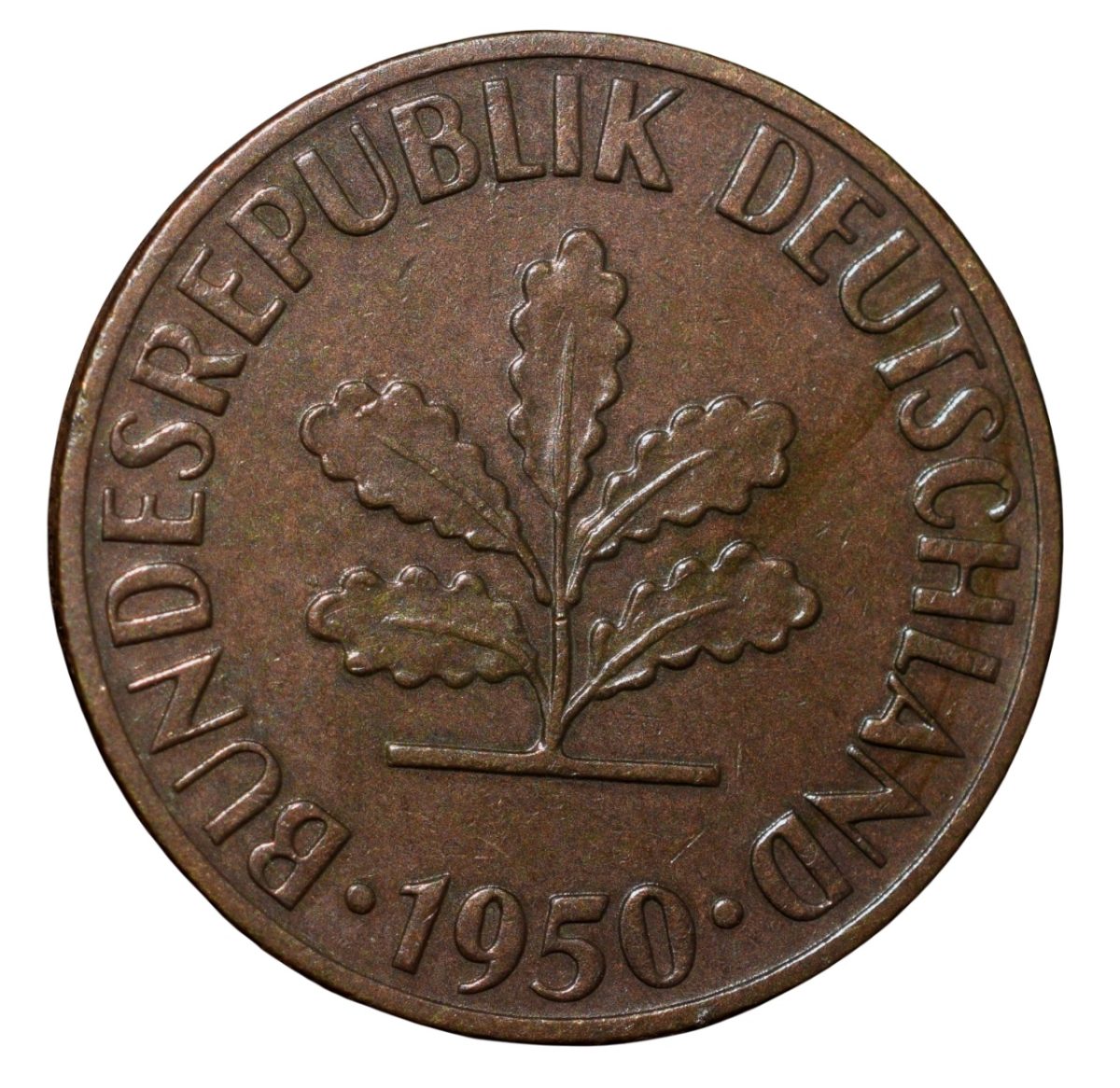 Brass 5 Pfennig of Germany (AD 1950) with Oak Sapling