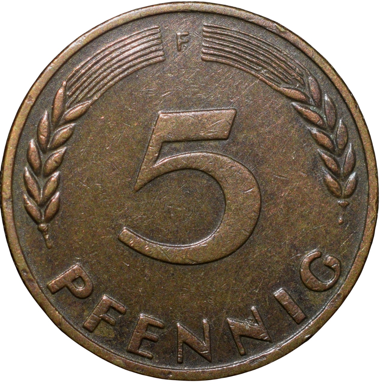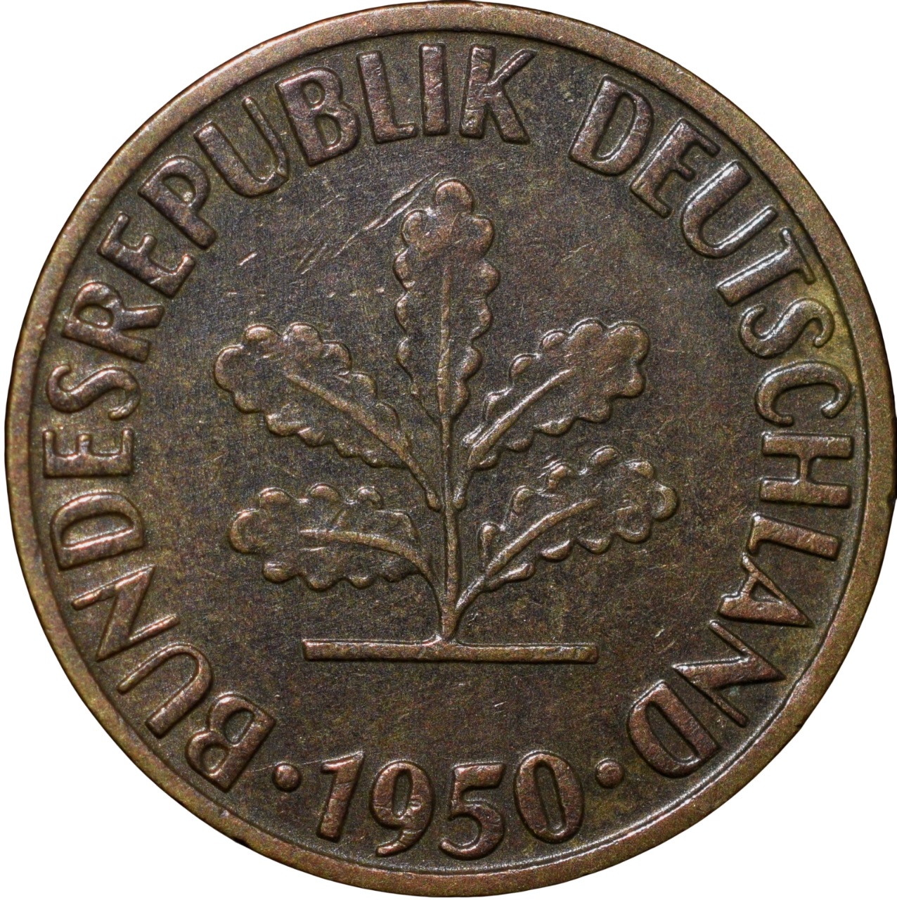 Brass 5 Pfennig of Germany (AD 1950) with Oak Sapling