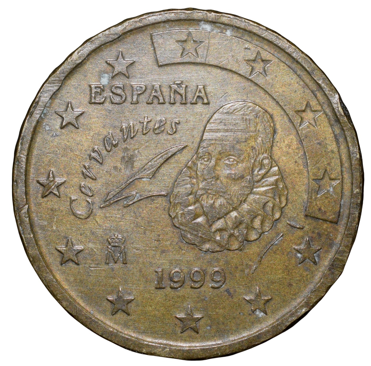 Brass 50 Euro Cents of Spain (AD 1999) with Spanish writer Miguel de Cervantes