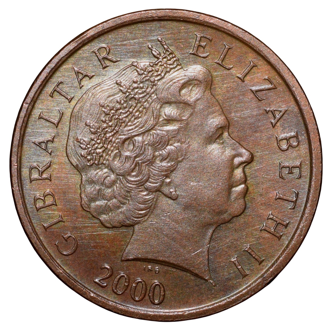 Gibratltar Country, Elizabeth II, (AD 2000), Bronze 1 Penny, Obv: Right facing head of Queen Elizabeth II, wearing the ” Girls of Great Britain and Ireland ” Tiara, legend and date around, Rev: Barbary partridge Bird & Denomination, 3.56 Gms, 20.32 mm, About UNC Grade, Rare.