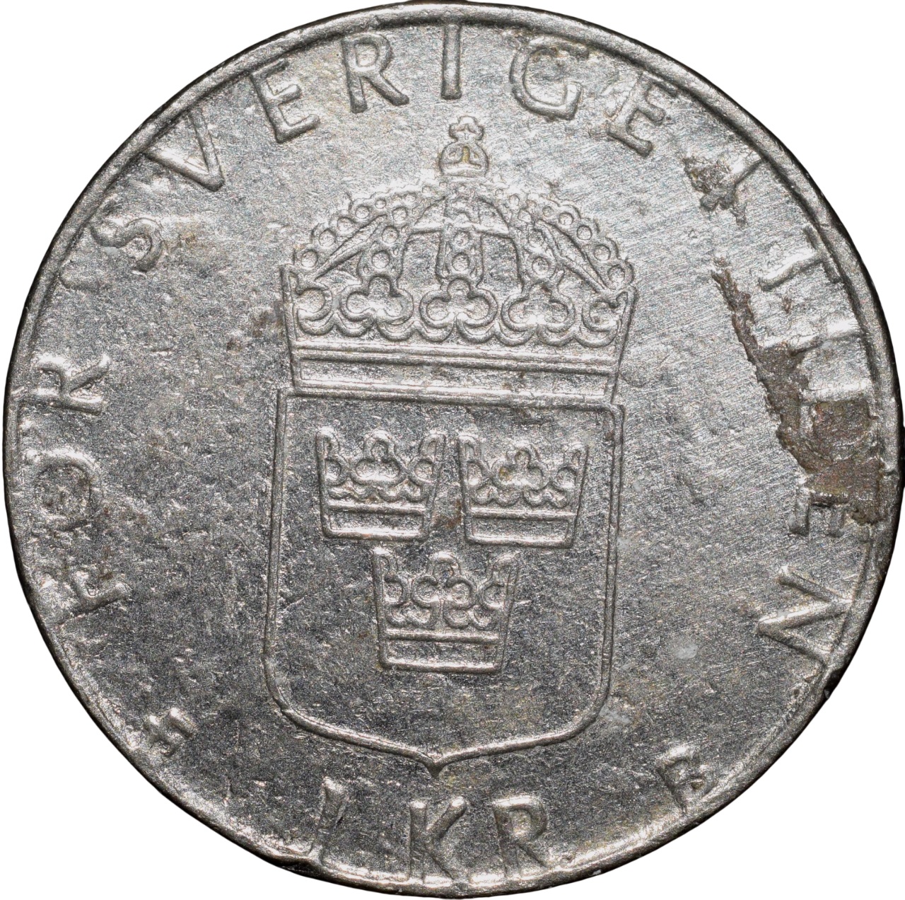 Sweden, Gustaf VI (AD 1999), Copper-Nickel 1 Krone, Obv: Profile Portrait facing left & Inscription around, Rev: Denomination & Date, 6.68 Gms, 24.95 mm, Very Fine, Scarce.