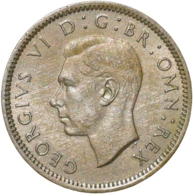 United Kingdom, George VI (AD 1948), Copper-Nickel 6 Pence, Obv: George VI facing left, Inscription around, Rev: Flowers in center, Date and Denomination around, 2.84 Gms, 18.44 mm, Very Fine, Scarce.