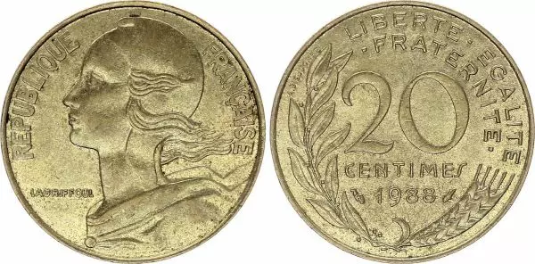 France, 20 Centimes, 1988, KM #930, Fine Condition.