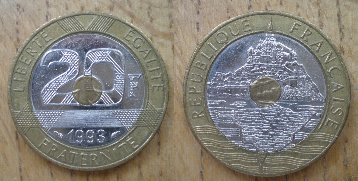 France, 20 Francs, 1993, Mont Saint Michel, Trimetal, KM #1008, Fine Condition.