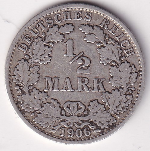Germany 1/2 MARK 1906 A Berlin Mint 2.77 Grams Silver Coin