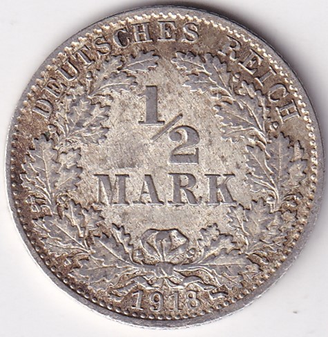 Germany 1/2 MARK 1918 D Munich Mint 2.77 Grams Silver Coin