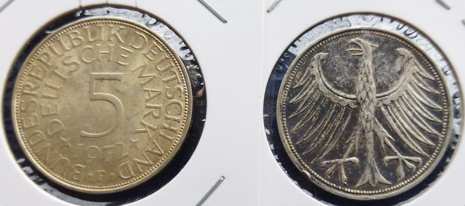 Germany, 5 Deutsche Mark, 1965/1972, Silver, KM #112, Circulated Condition.
