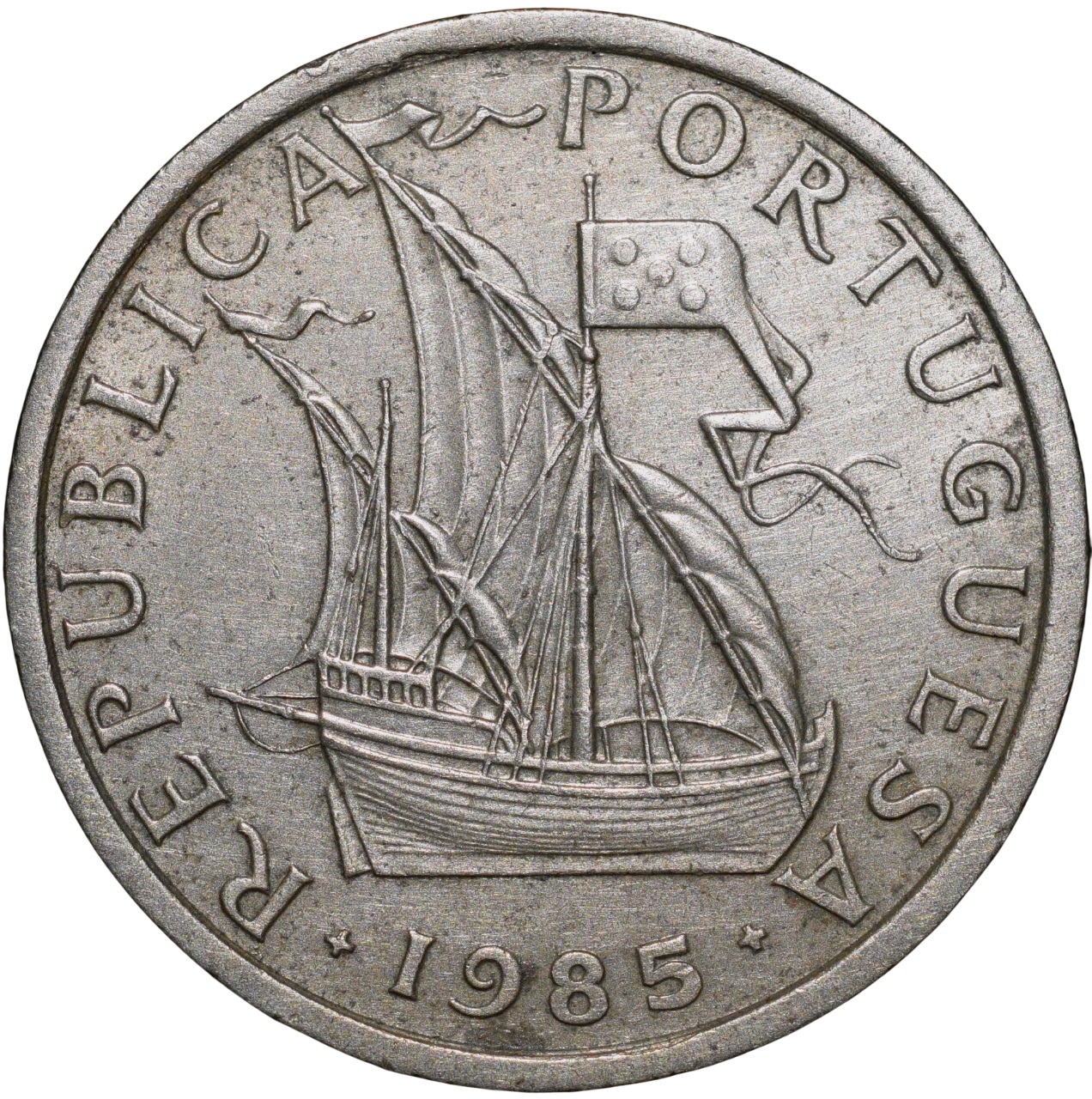 Portuguesa, (AD 1985), Nickel 5 Escudos, Obv: Ship in Centre, Date & Inscriptions around, Rev: Shield & Denomination, 6.96 Gms, 24.45 mm, Extremely Fine.