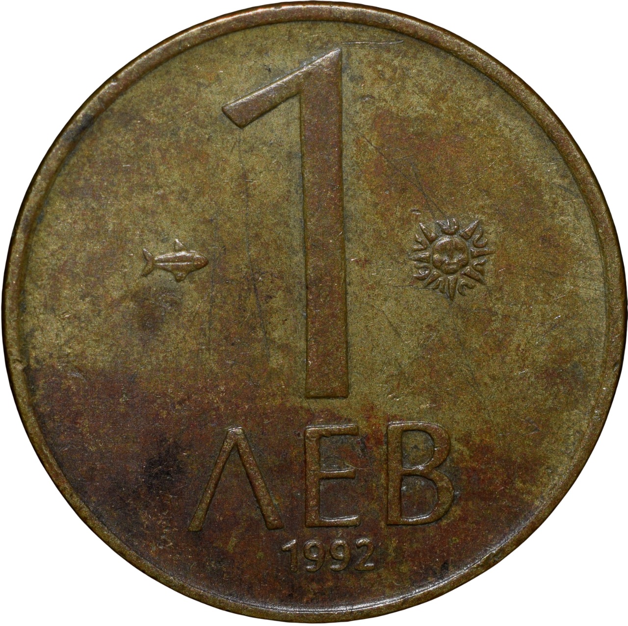 Nickel-Brass 1 Leva of Bulgaria Country (AD 1992) with The Madara Rider on his horse, killing a lion with a spear