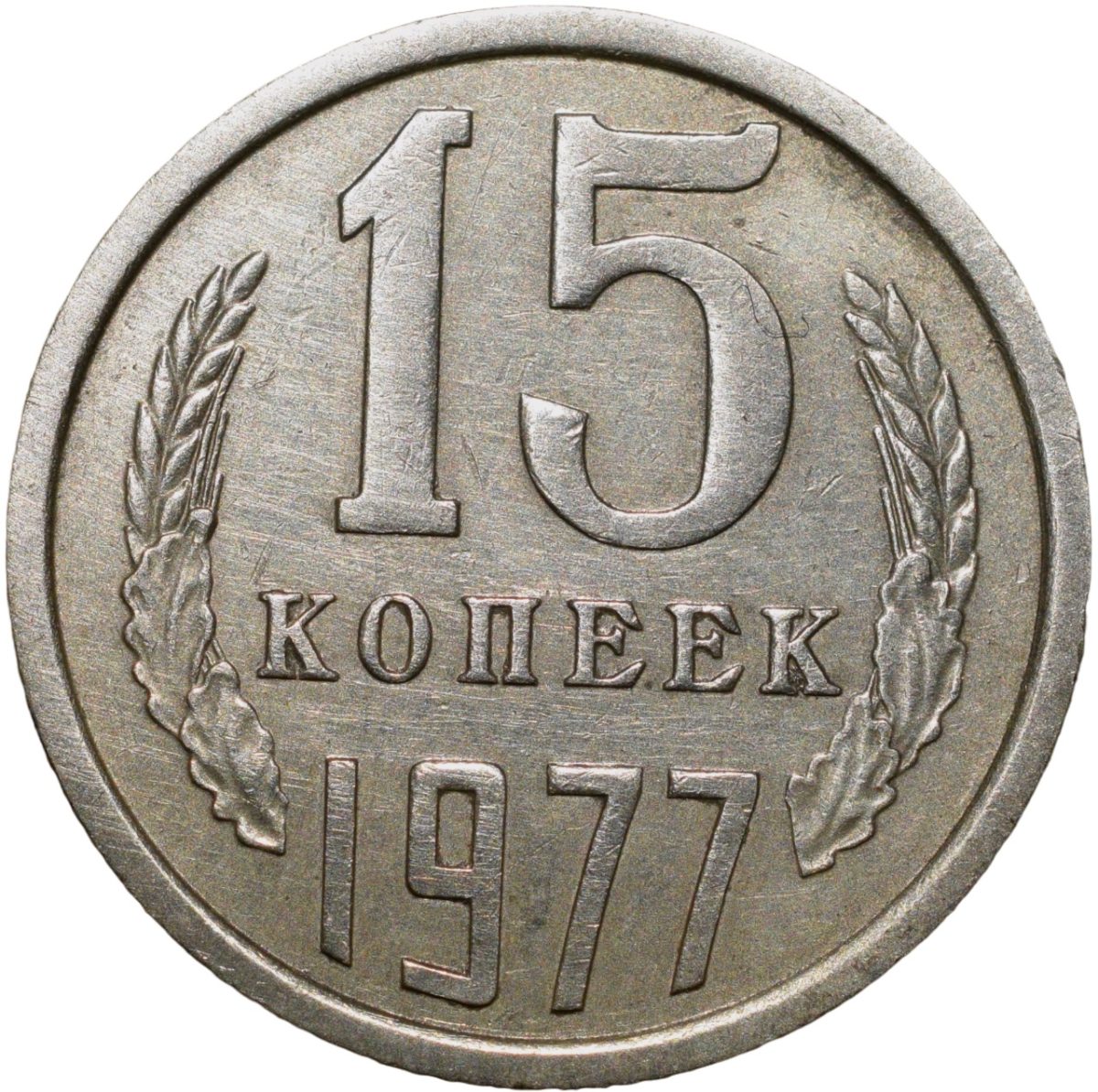 Russia, (AD 1977), Nickel-Brass 15 Kopecks, Obv: The arms of the Soviet Union (a hammer and sickle overlain on a globe above the sun with rays, all within wreath or sheaf of wheat stalks, star above within 15 ribbons on the wreath (7 + 1 + 7 ribbons), Rev: The denomination above the date within a partial wreath, 2.46 Gms, 19.00 mm, Extremely Fine.