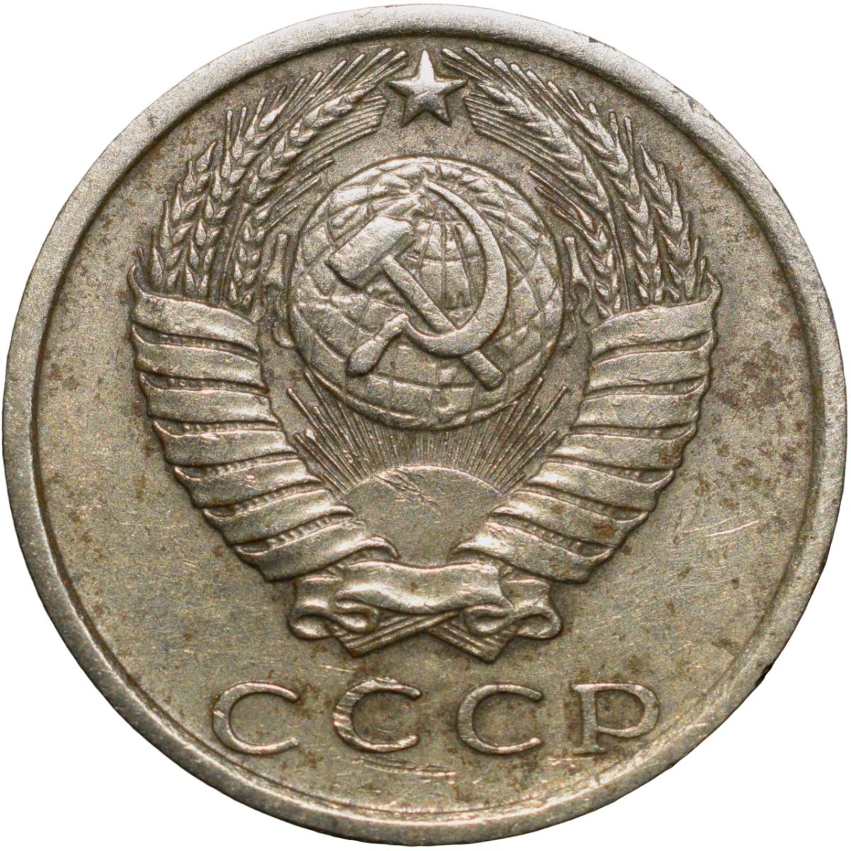 Russia, (AD 1979), Nickel-Brass 15 Kopecks, Obv: The arms of the Soviet Union (a hammer and sickle overlain on a globe above the sun with rays, all within wreath or sheaf of wheat stalks, star above within 15 ribbons on the wreath (7 + 1 + 7 ribbons), Rev: The denomination above the date within a partial wreath, 2.46 Gms, 19.00 mm, Extremely Fine.