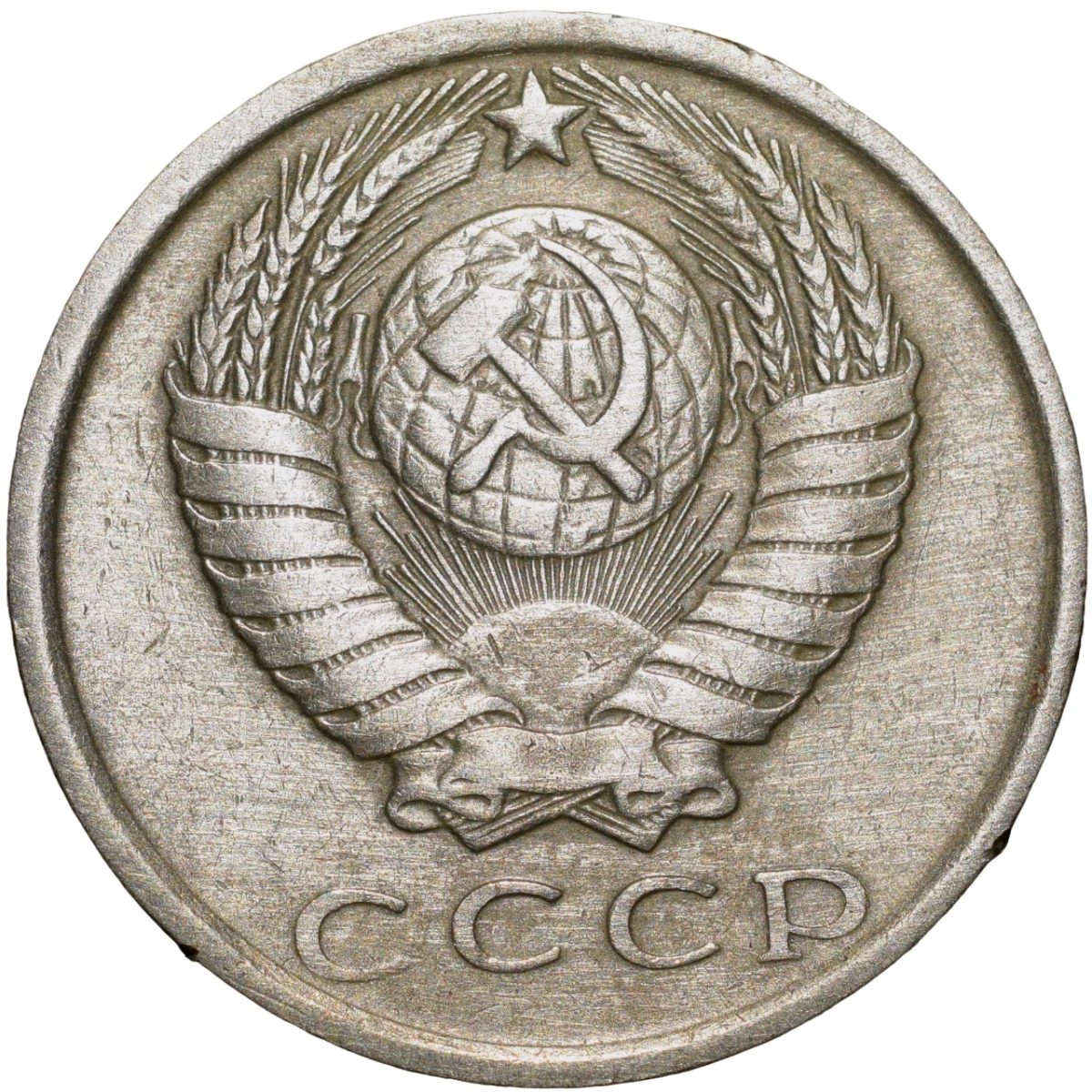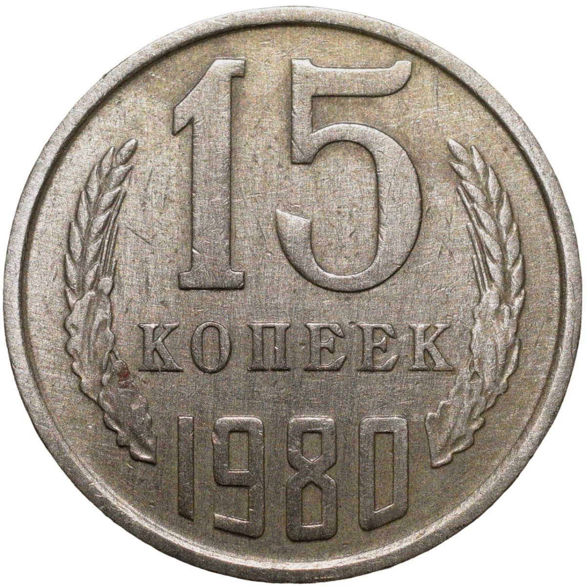 Russia, (AD 1980), Nickel-Brass 15 Kopecks, Obv: The arms of the Soviet Union (a hammer and sickle overlain on a globe above the sun with rays, all within wreath or sheaf of wheat stalks, star above within 15 ribbons on the wreath (7 + 1 + 7 ribbons), Rev: The denomination above the date within a partial wreath, 2.46 Gms, 19.00 mm, Extremely Fine.