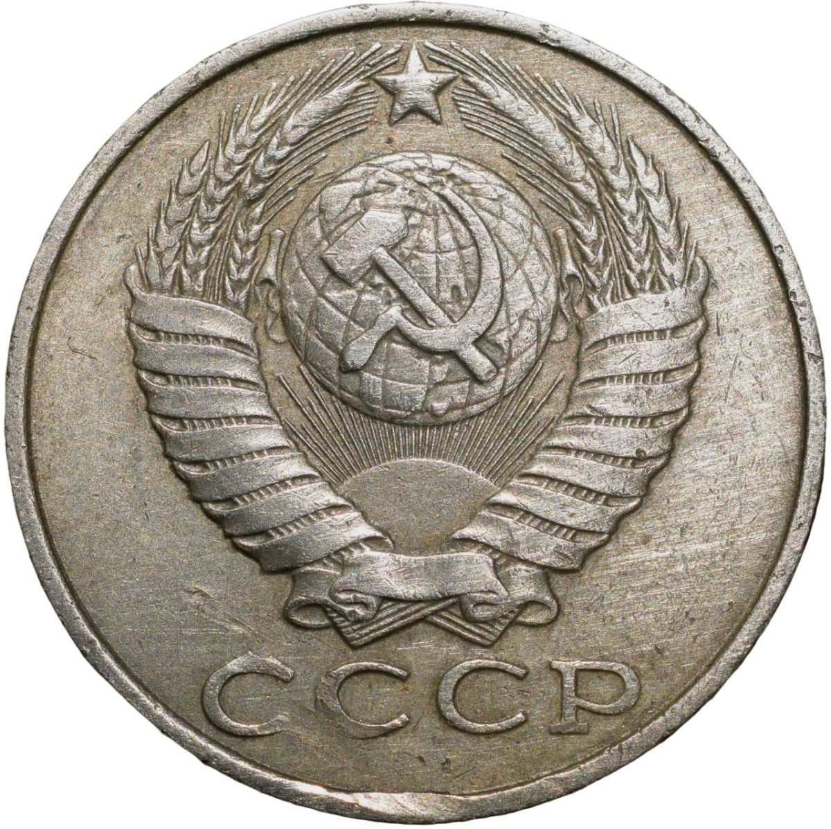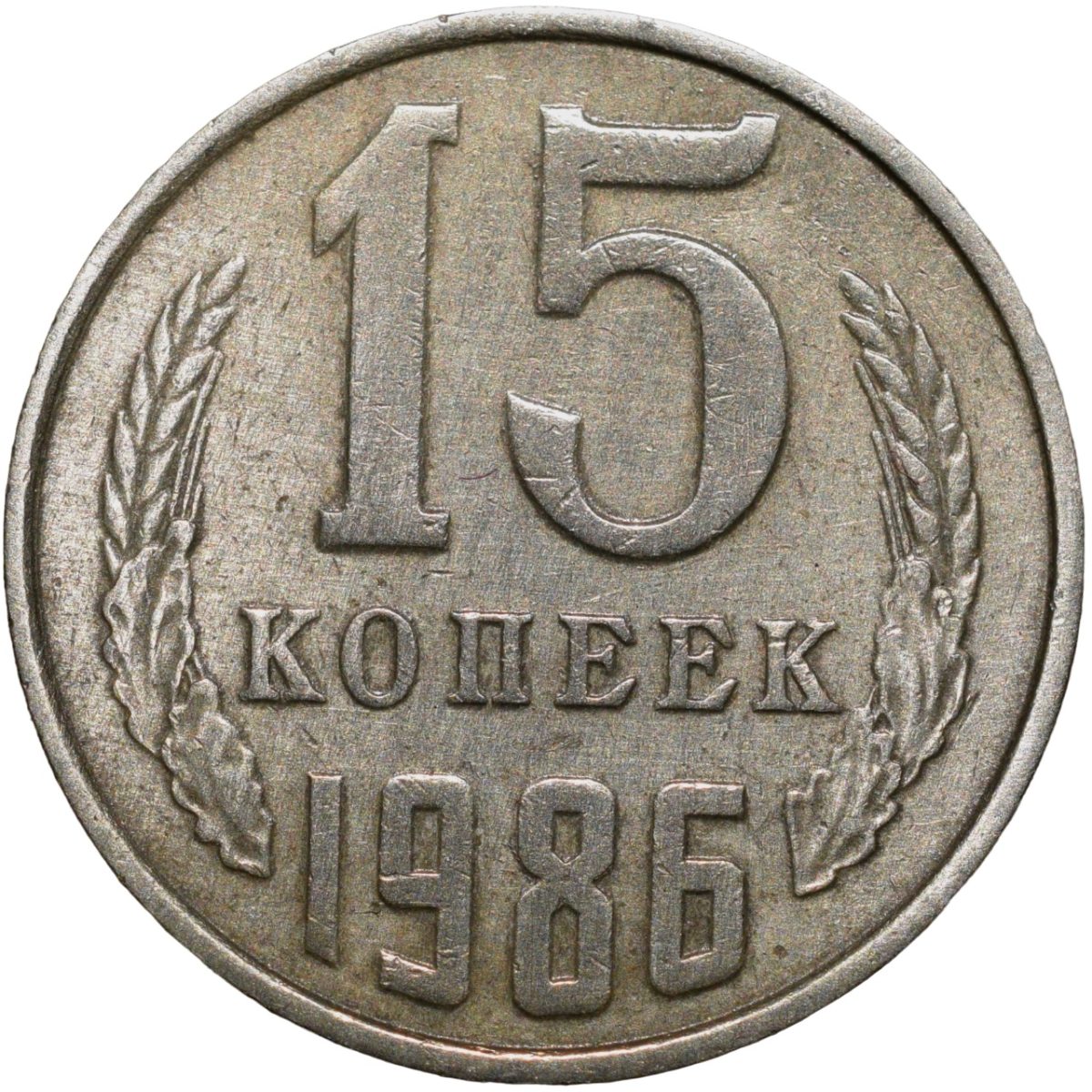 Russia, (AD 1986), Nickel-Brass 15 Kopecks, Obv: The arms of the Soviet Union (a hammer and sickle overlain on a globe above the sun with rays, all within wreath or sheaf of wheat stalks, star above within 15 ribbons on the wreath (7 + 1 + 7 ribbons), Rev: The denomination above the date within a partial wreath, 2.46 Gms, 19.00 mm, Extremely Fine.