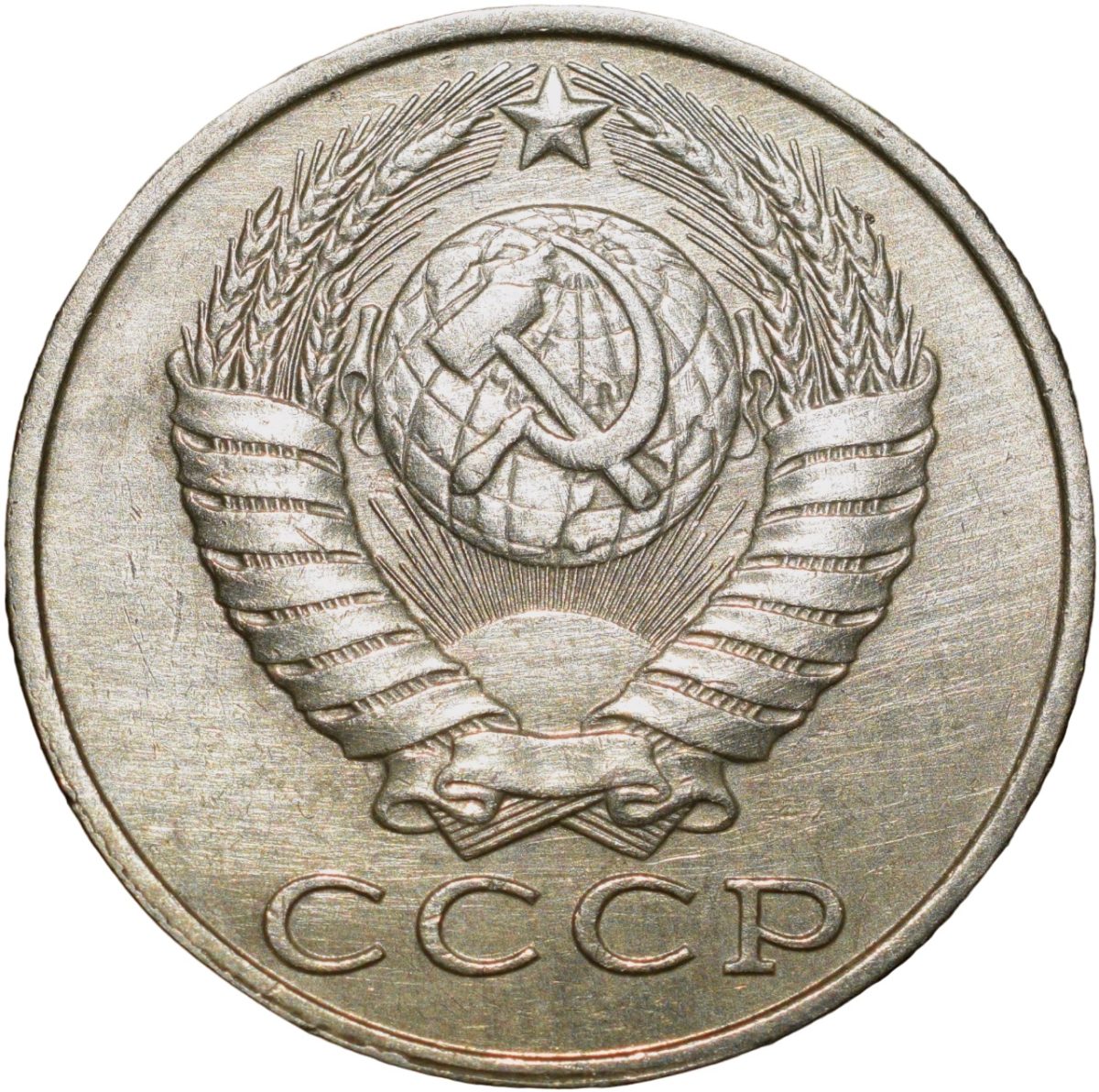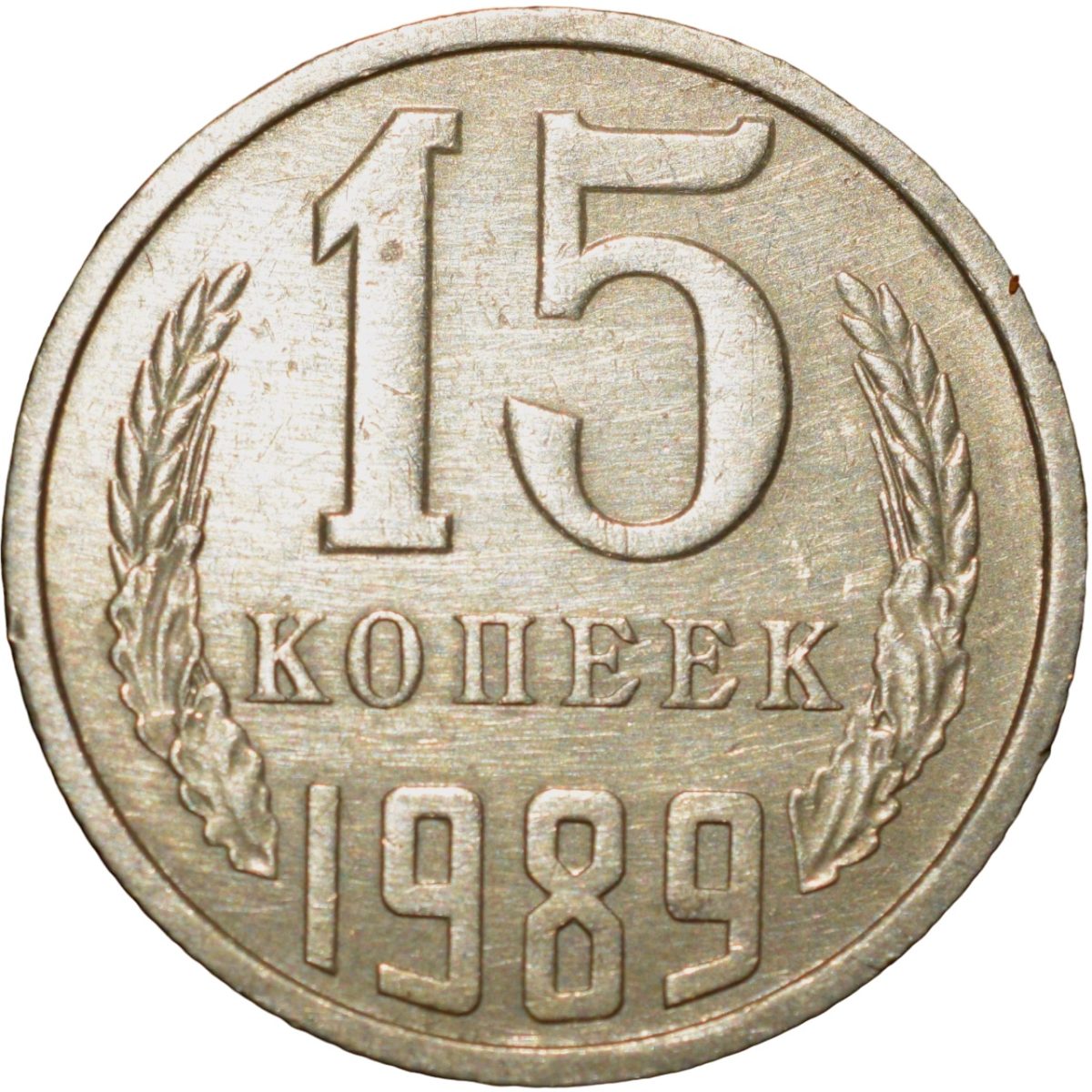 Russia, (AD 1989), Nickel-Brass 15 Kopecks, Obv: The arms of the Soviet Union (a hammer and sickle overlain on a globe above the sun with rays, all within wreath or sheaf of wheat stalks, star above within 15 ribbons on the wreath (7 + 1 + 7 ribbons), Rev: The denomination above the date within a partial wreath, 2.46 Gms, 19.00 mm, Extremely Fine.