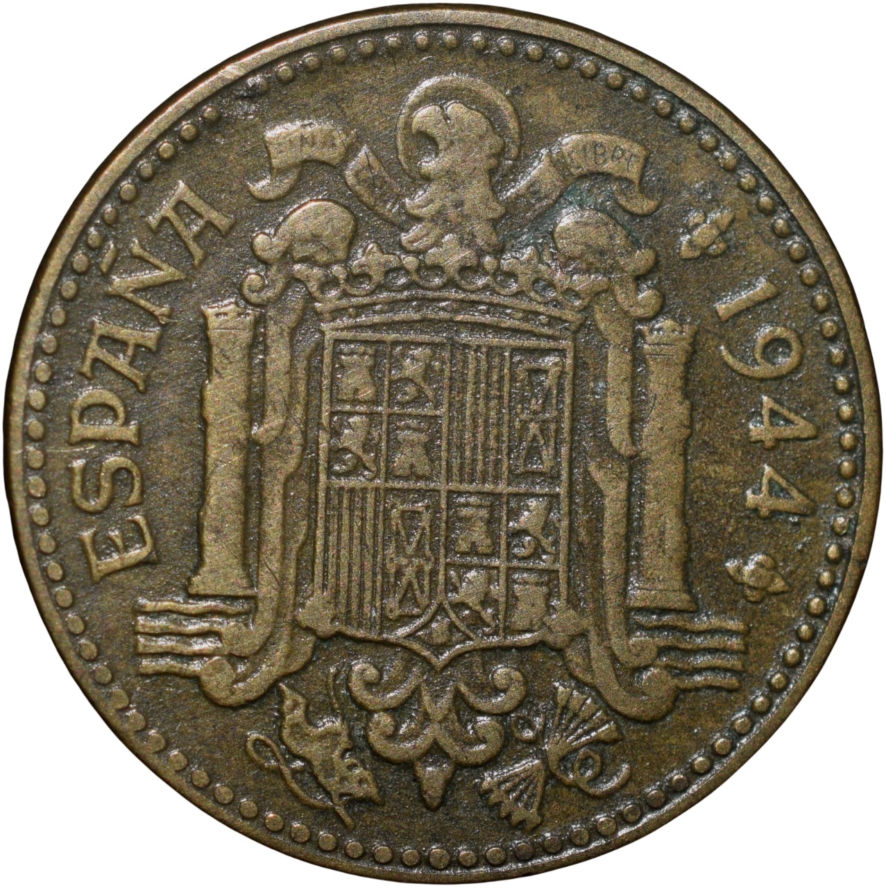 Old Brass 1 Peseta of Spain Country (AD 1944) with Pattern with elements of coat of arms of Spain