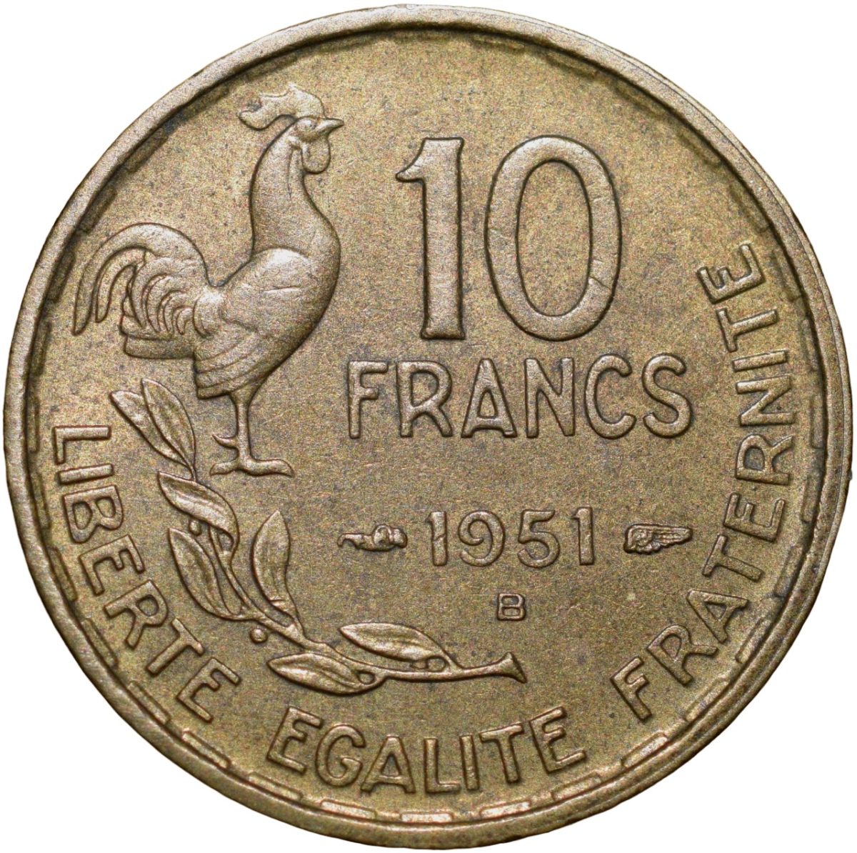 Old Brass 10 Francs of France Country (AD 1951) with Rooster Scarce