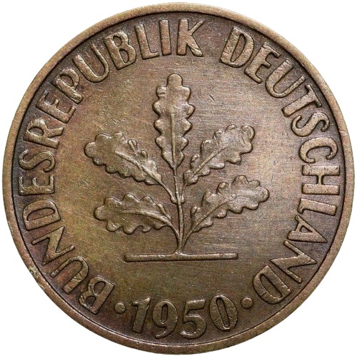 Old Brass 10 Pfennings of Germany (AD 1950) with Oak Sapling
