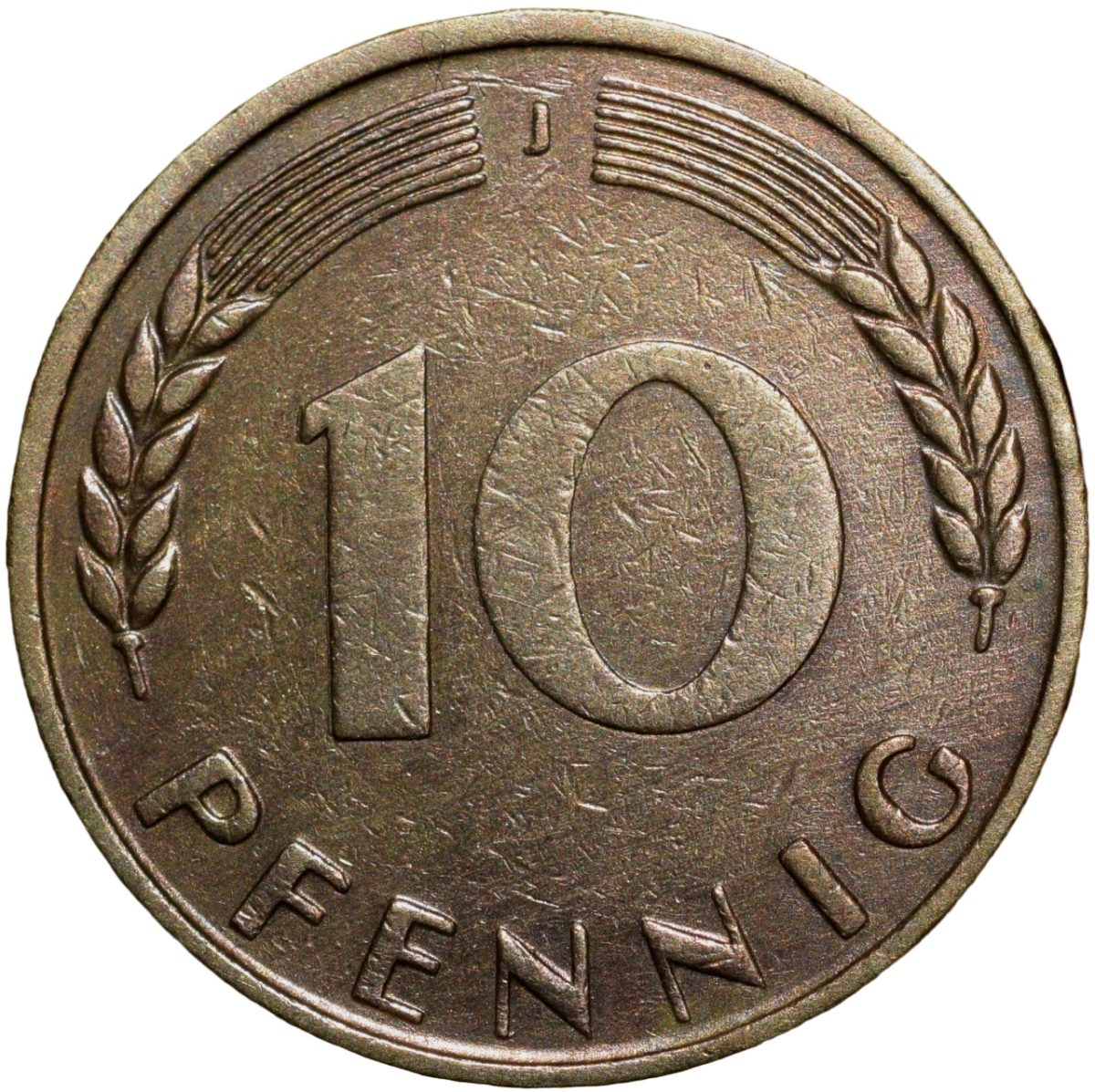 Germany Country, (AD 1950), Brass 10 Pfennings, Obv: Date & Inscription around Oak Sapling, Rev: Denomination, 4.03 Gms, 21.26 mm, Very Fine.