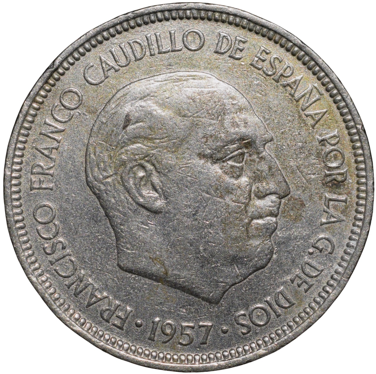 Spain Country, Francisco Franco, (AD 1957), Copper-Nickel Pesetas, Obv: Profile Bust facing Right, Inscription & Date, Rev: Arms of Spain & Denomination, 5.82 Gms, Very Fine.