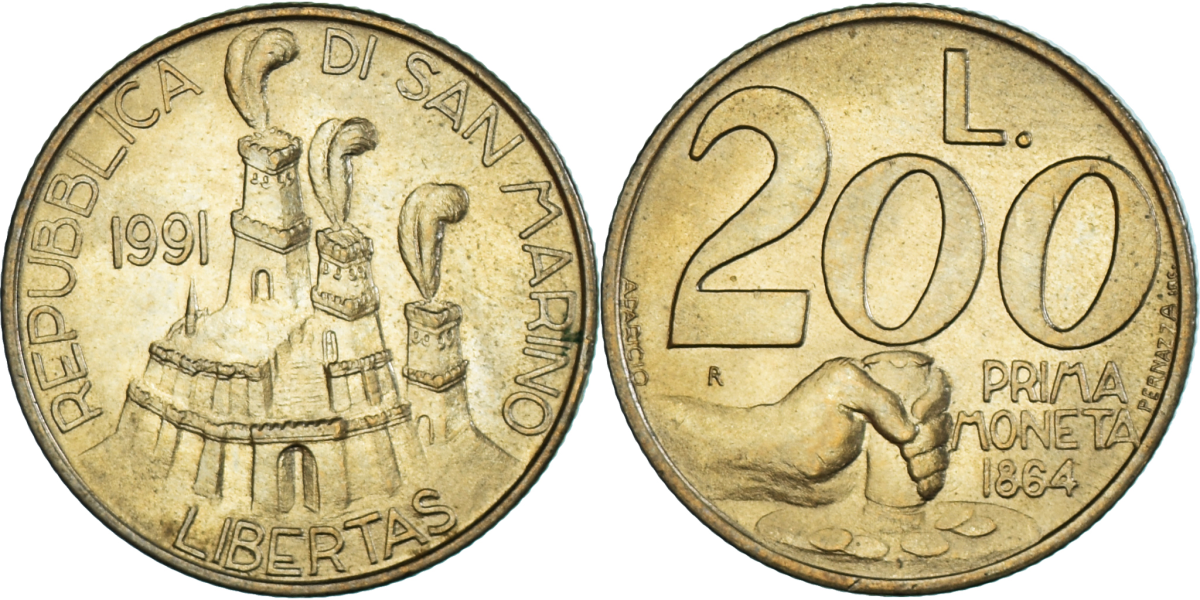 San Marino, 1991, 200 Lire, KM #268, First coin, Fine Condition.