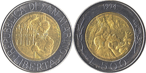 San Marino, 500 Lire, 1994, Life and Legend of Holy Marinus of Dalmatia – Donna Felicissima, Bimetal, KM #314, Circulated Condition.