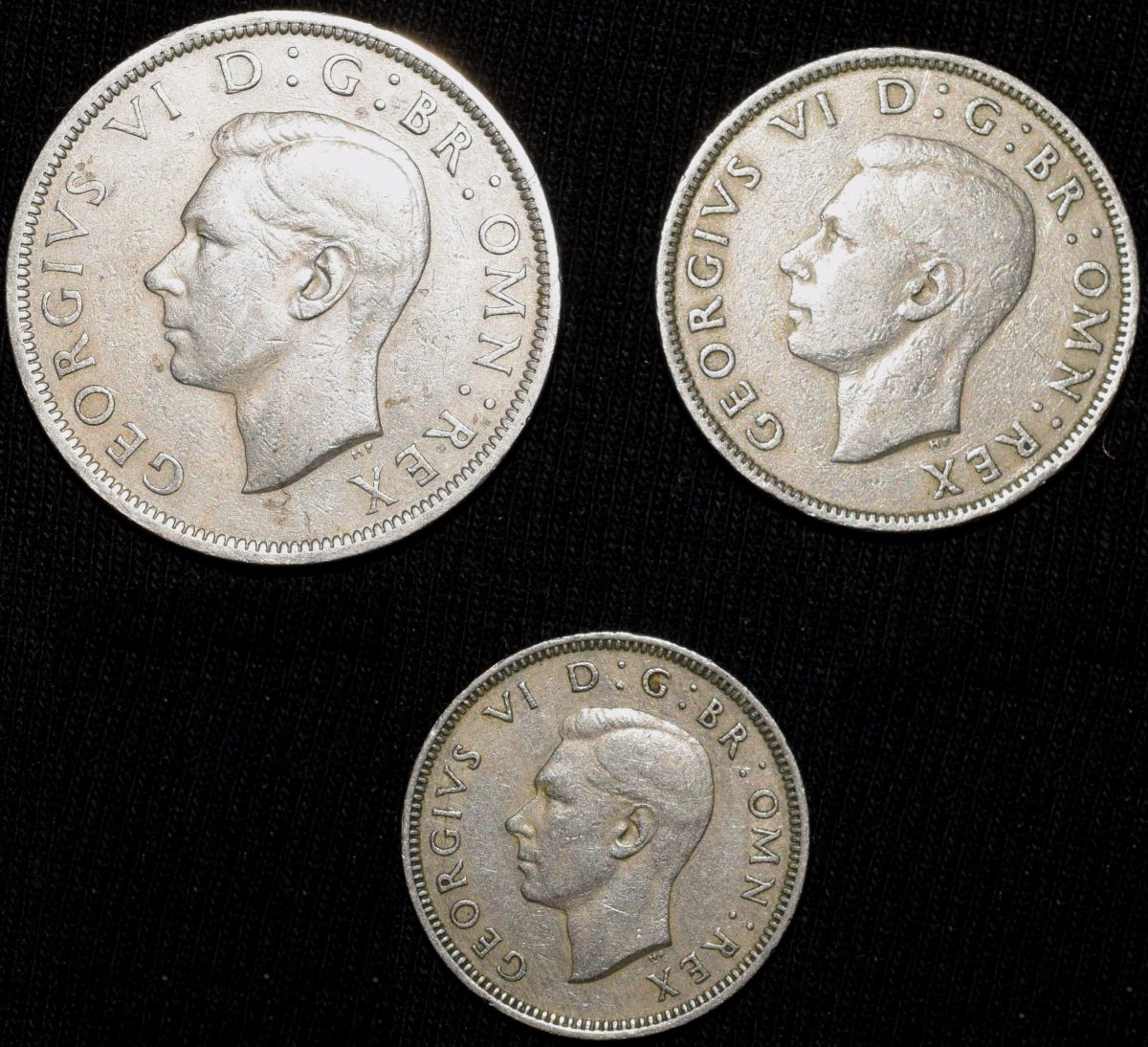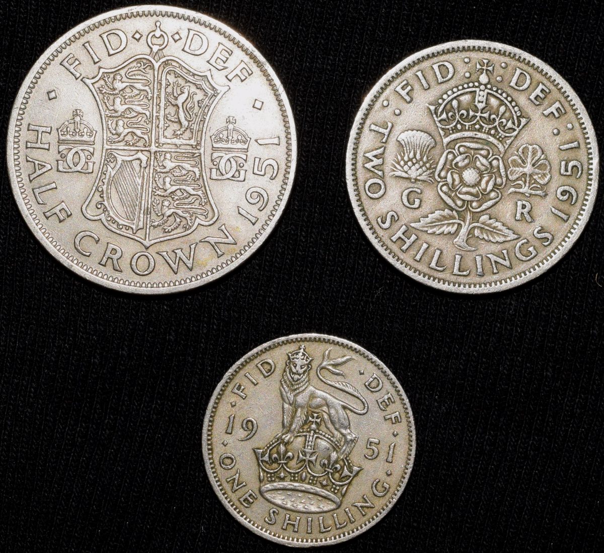 Set of 3 Different Copper-Nickel 1/2 Crown – 2 Shillings & 1 Shilling of George VI (AD 1951) from Great Brittain