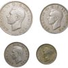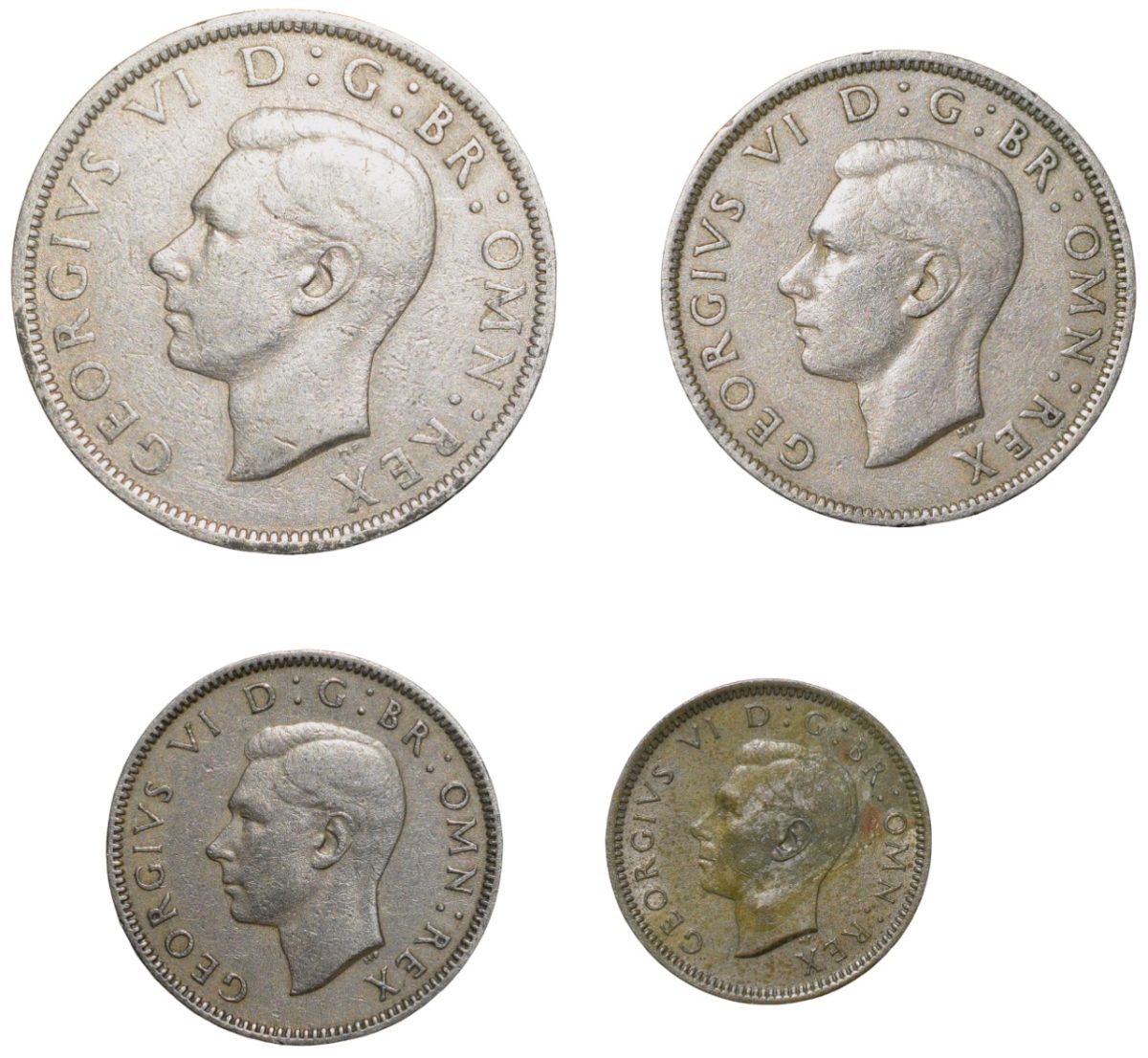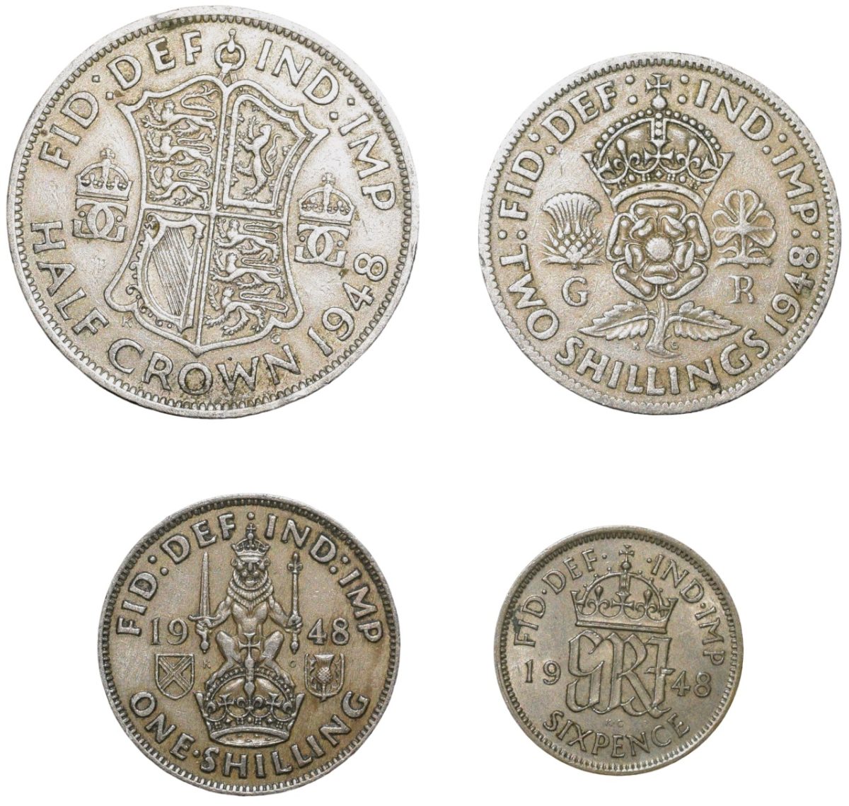 Set of 4 Different Copper-Nickel 1/2 Crown – 2 Shillings, 1 Shiling & 6 Pence of George VI (AD 1948) from Great Brittain