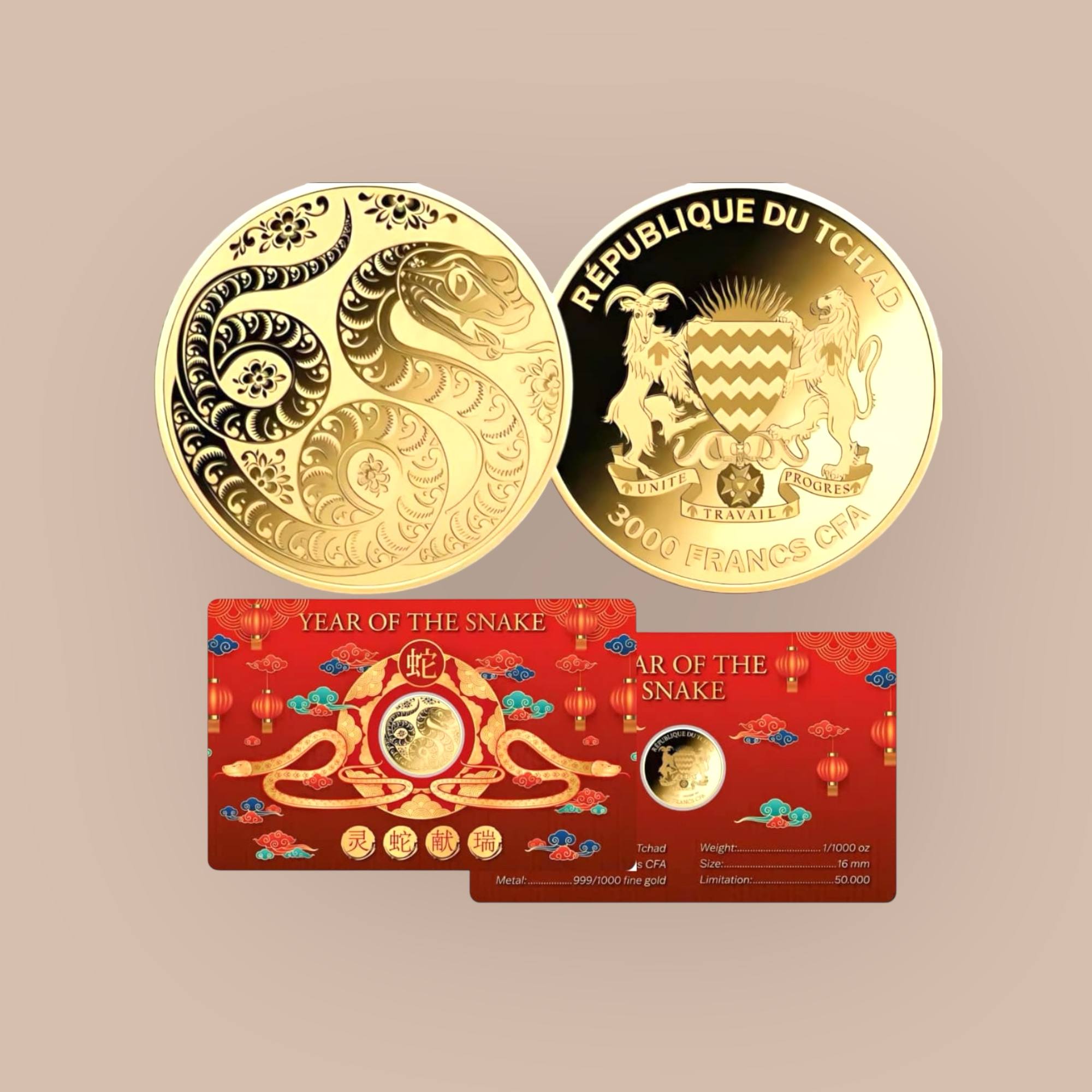This charming Gold coin is dedicated to the Chinese zodiac sign of the Snake, known for being smart, wise, determined, and caring. People born under this zodiac sign value knowledge, work hard to achieve goals, and form deep bonds in relationships. This Gold coin is beautifully packaged in a blister, with the Certificate of Authenticity embedded on its back. Limited mintage of 50.000 pieces worldwide! The reverse of this Gold coin depicts the Chinese zodiac sign of the Snake, meticulously detailed and adorned with a beautiful Chinese pattern. The obverse of this Gold coin depicts the Coat of Arms of Chad and the inscriptions: “REPUBLIQUE DU TCHAD” – the issuing country, and “3000 FRANCS CFA
