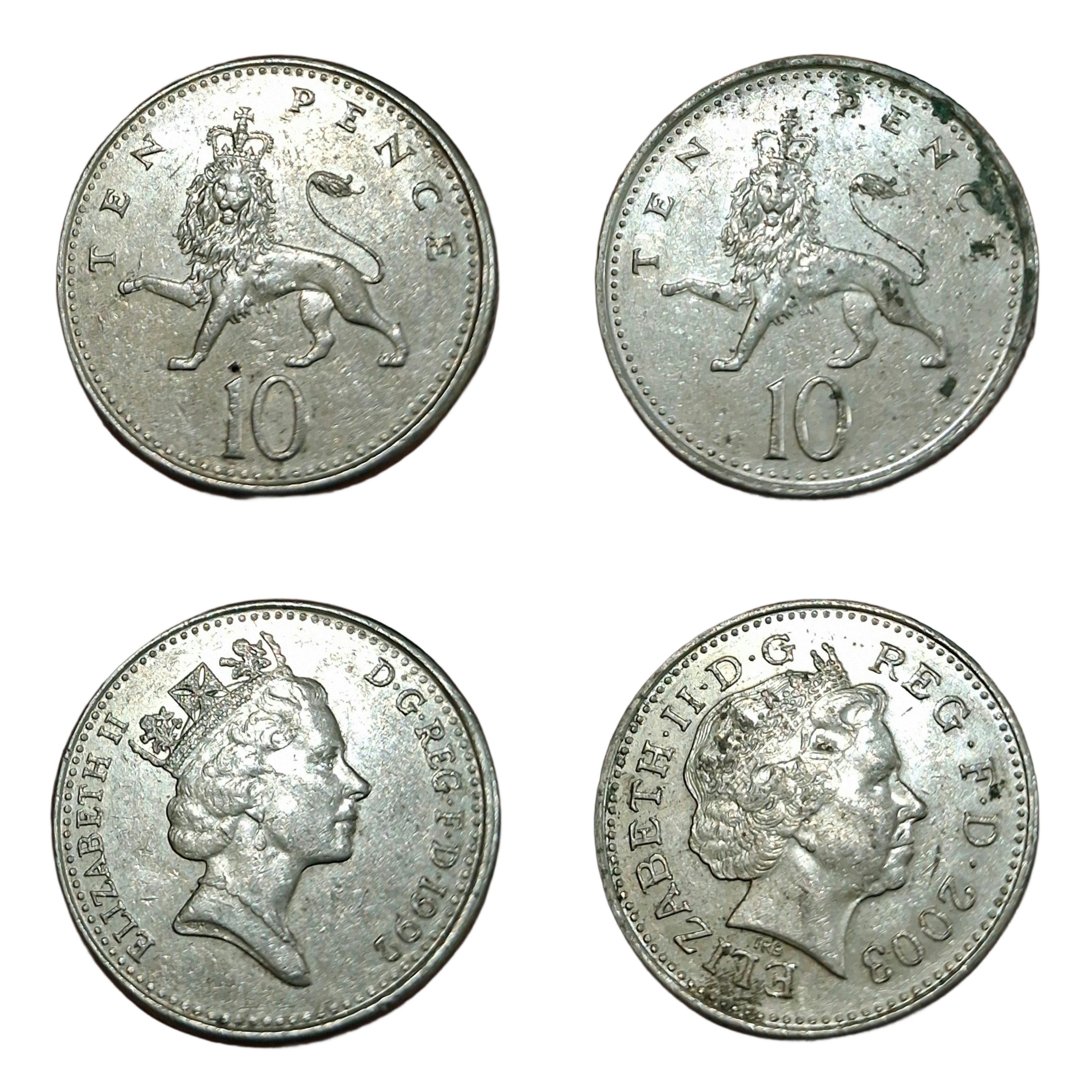 GREAT BRITAIN Cu/Ni TEN PENCE Year 1992 and 2003 Queen ELIZABETH-II “Young & Mature” Portraits SET 2 Coins **SCARE** High Collectable Grades.