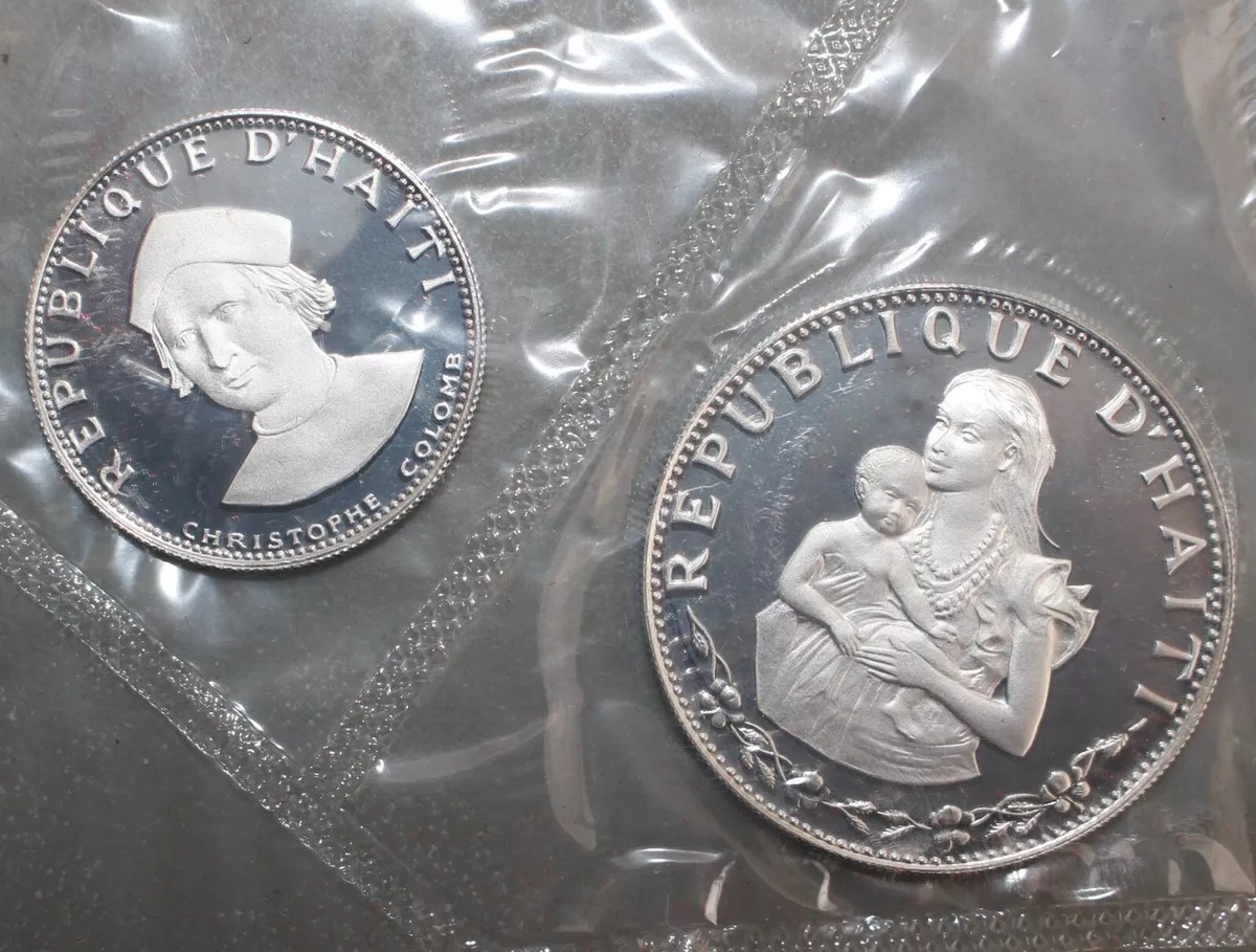 Step into the world of numismatics with the 1973 Haiti Proof Set, a rare and exquisite collection of four silver coins. Issued by the Government of the Republic of Haiti, these coins showcase the rich heritage and culture of the Caribbean country. The set includes two 50 Gourdes coins featuring elegant designs of a woman on the beach and a woman with a child, as well as two 25 Gourdes coins depicting Christopher Columbus and the World Cup. Minted by the Banque Nationale de la Republique d’Haiti, these coins are struck from 0.925 silver and are expected to grade as Proof (PF). Encased in their original black display case and accompanied by a certificate of authenticity, this set is a treasure for any collector or enthusiast seeking a piece of Haitian history.
