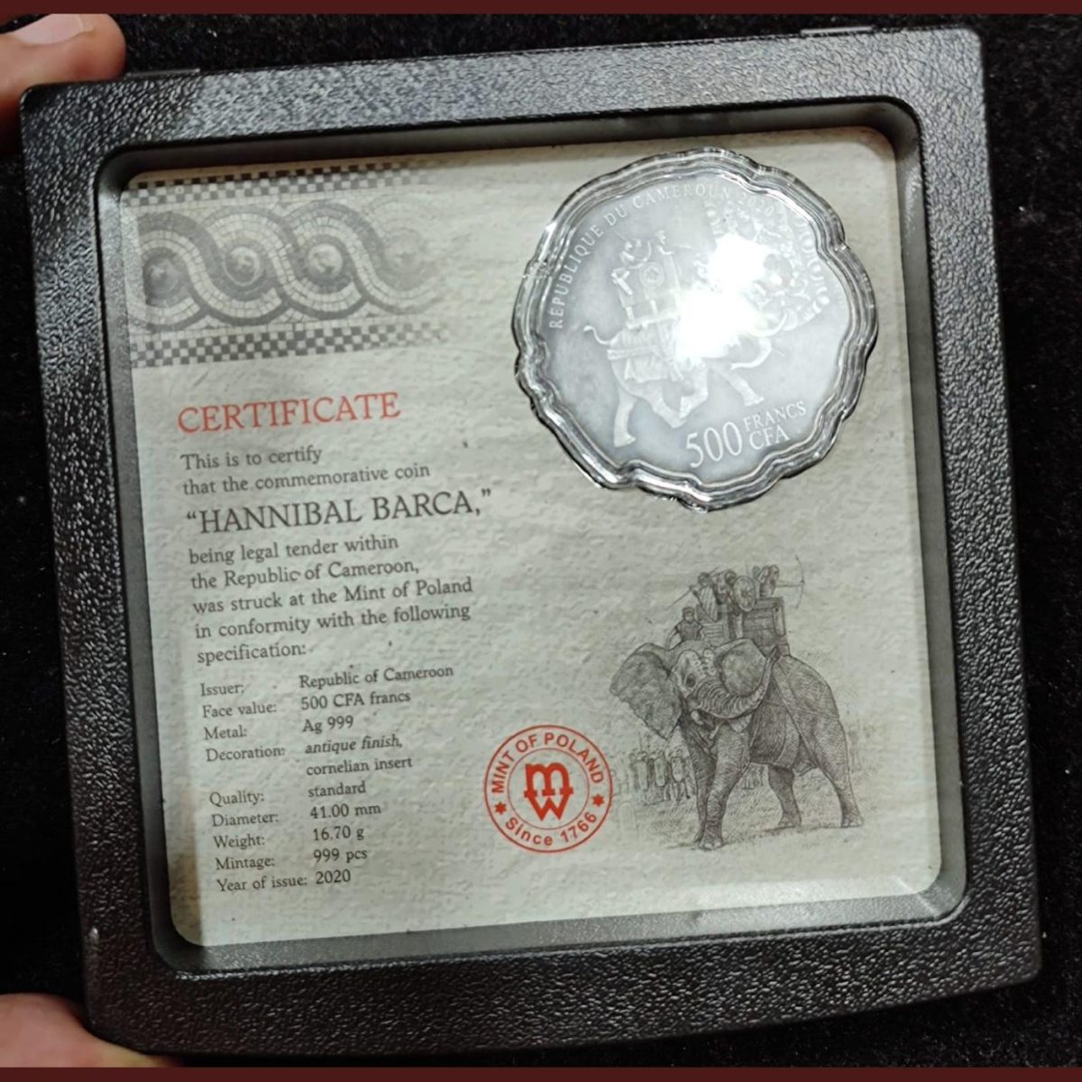 HANNIBAL BARCA – THE GREATEST LEADER OF THE ANCIENT WORLD – 2020 500 FRANCS PURE SILVER COIN WITH CORNELIAN STONE INSERT – MINT OF POLAND – CAMEROON