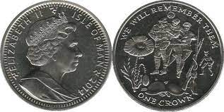 Isle of Man (British Crown dependencies), 1 Crown, 2014, Centenary of World War I – Christmas Day 1914, KM #1550, UNC Condition.