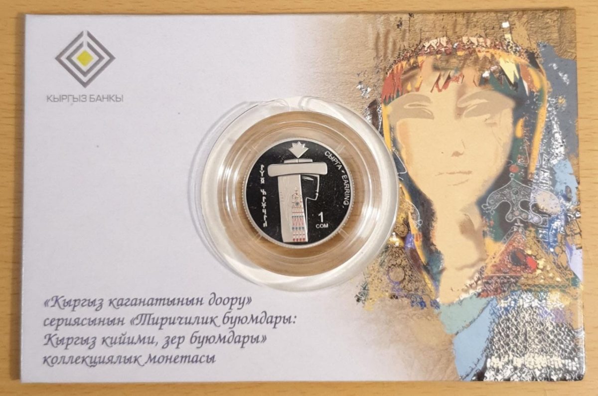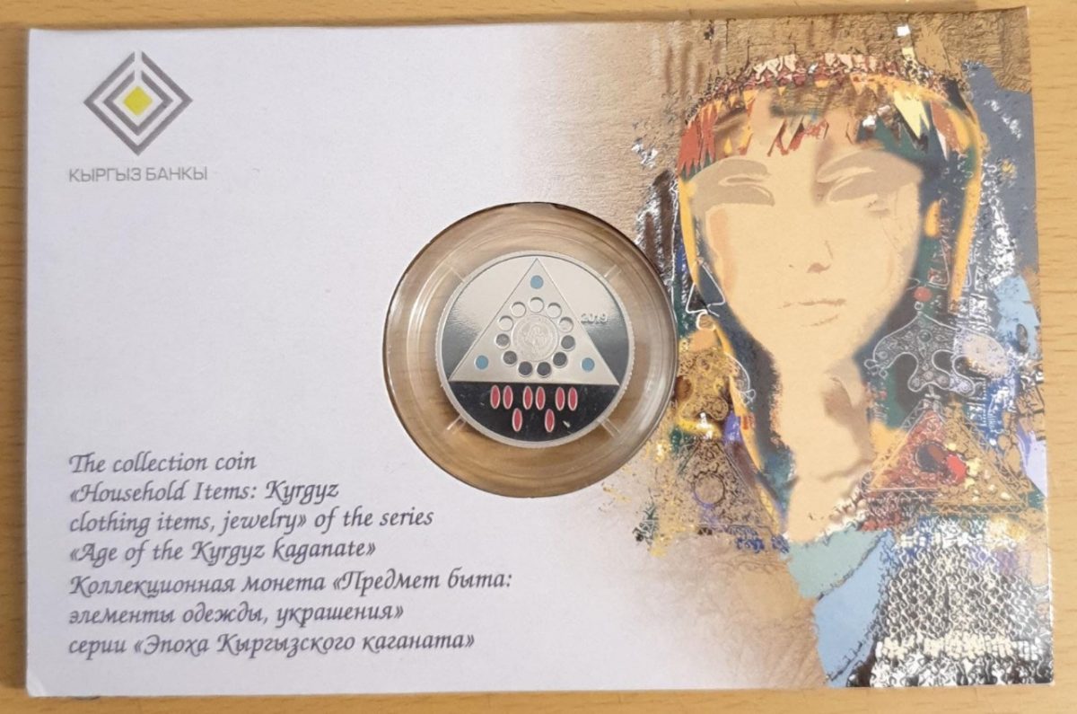 KYRGYZSTAN, 1 SOM, 2019, Kyrgyz jewellery: Age of the Kyrgyz kaganate, Colour, KM# 84, Mint Coin Card.