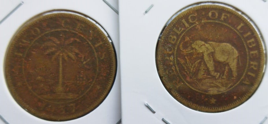 Liberia, 2 Cents, 1937, KM #12, Circulated Condition.
