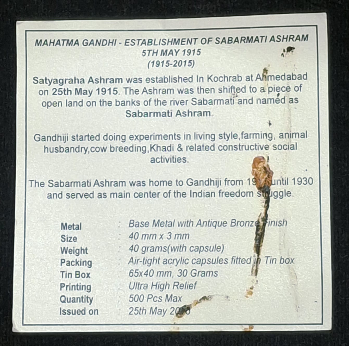 Mahatma Gandhi – establishment of sabarmati ashram 5th may (1915-2015) silver plated medallion with box & certificate