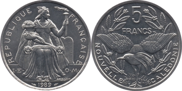 New Caledonia, 5 Francs, 1986, KM# 16, AUNC Condition.