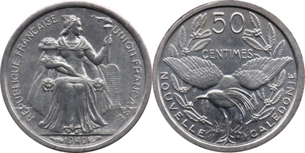 NEW CALEDONIA, 50 CENTIMES, 1949, KM# 1, Fine Condition.